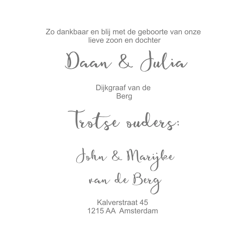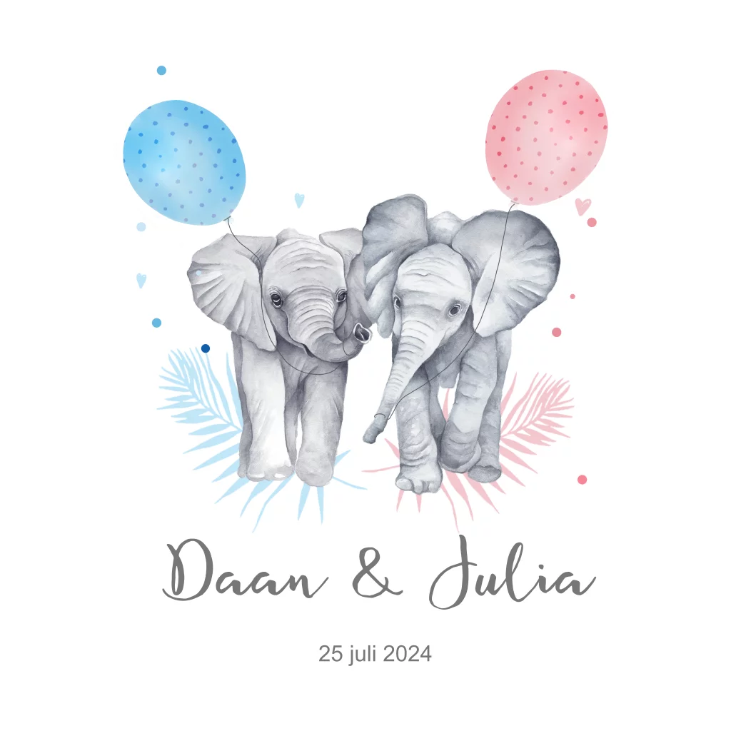 Geboortekaartje tweeling voor een meisje en jongen met twee lieve kleine olifantjes met ballonnen in hun slurfje. (3592)