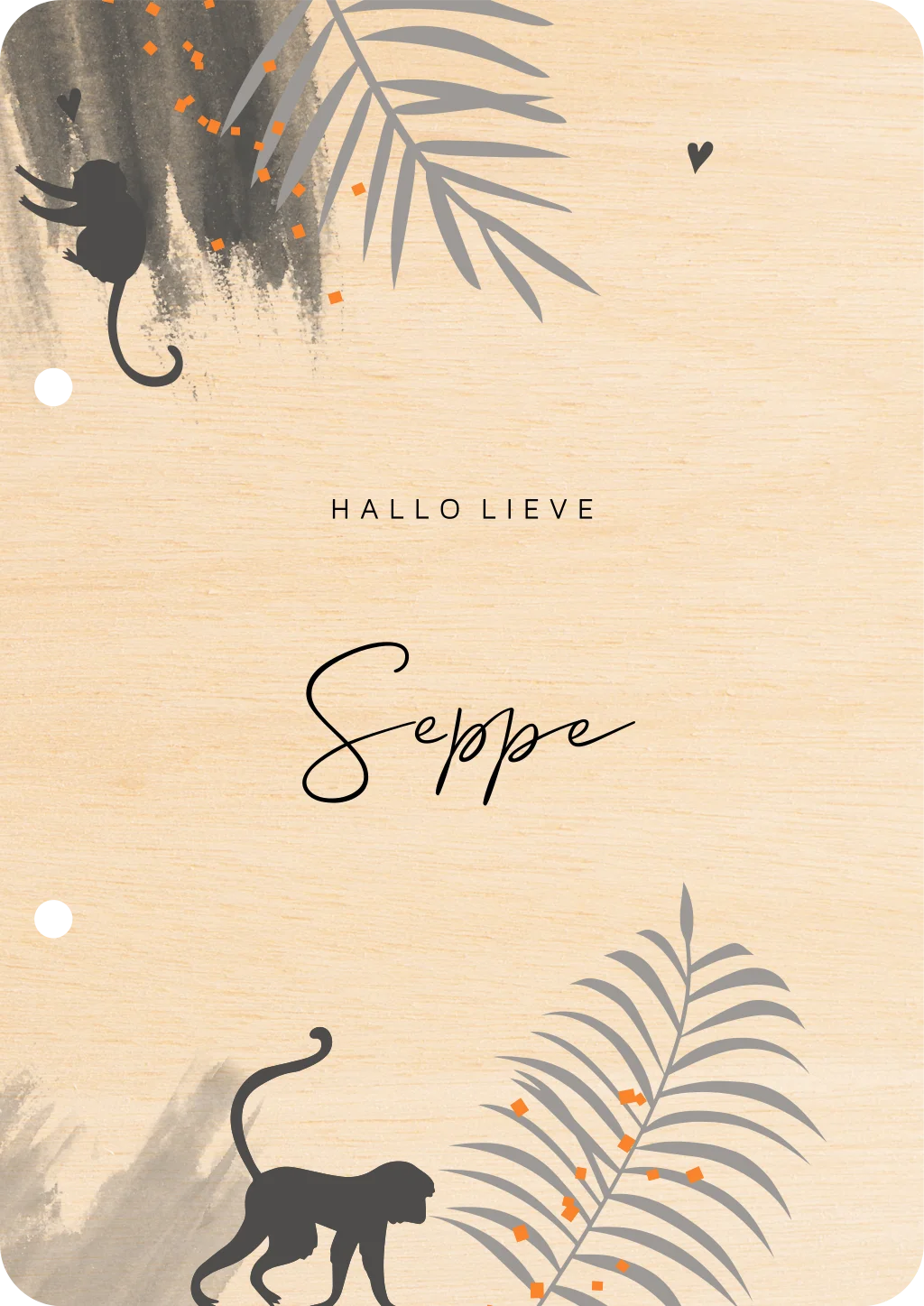 Houten bewaarbundel met tropische bladeren en aapjes.