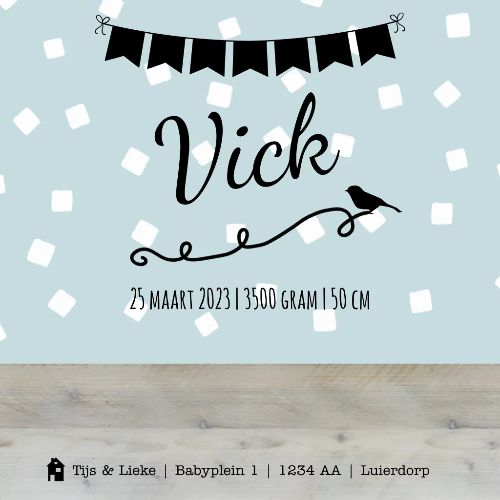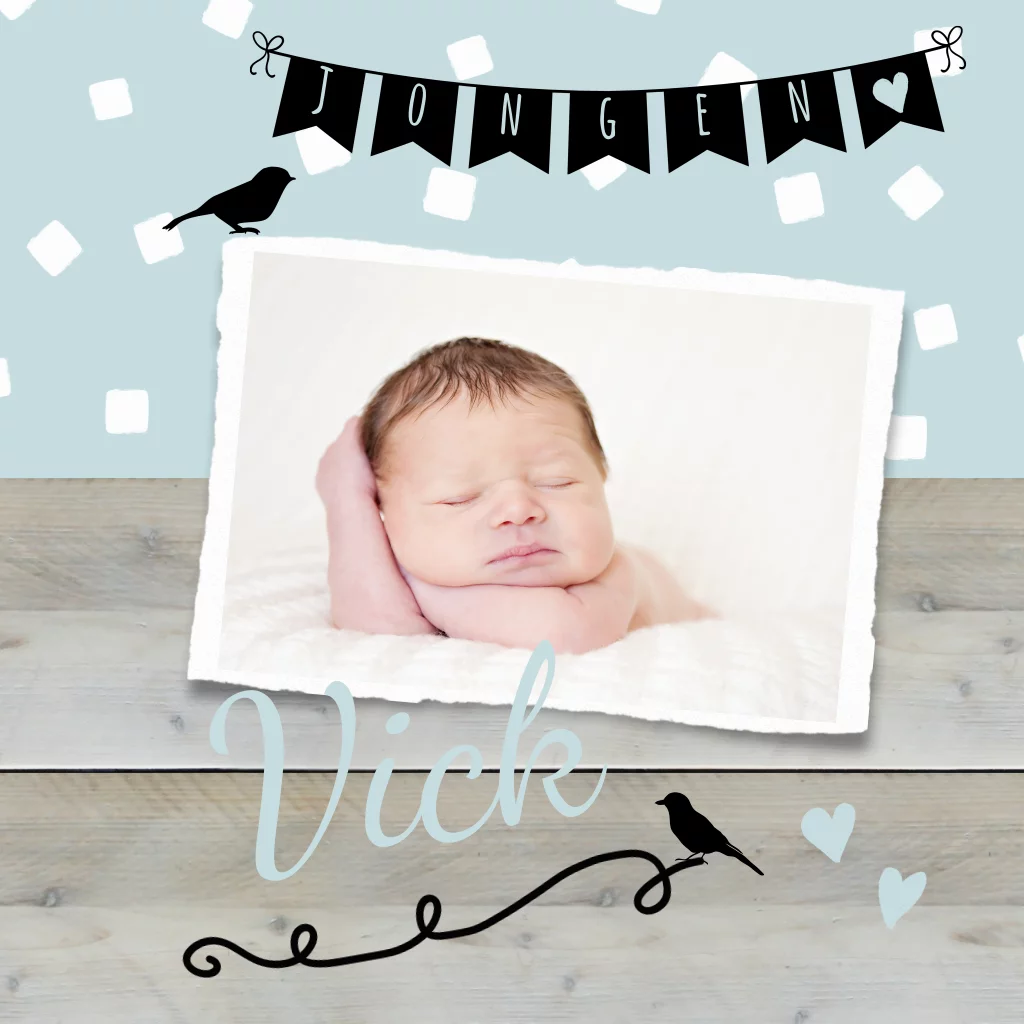 Hippe geboortekaart voor en jongen met pastelblauw, confetti, vogeltje, slinger en waar je een persoonlijke foto kan toevoegen.