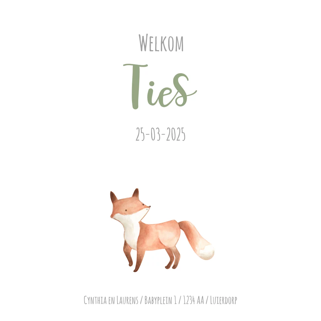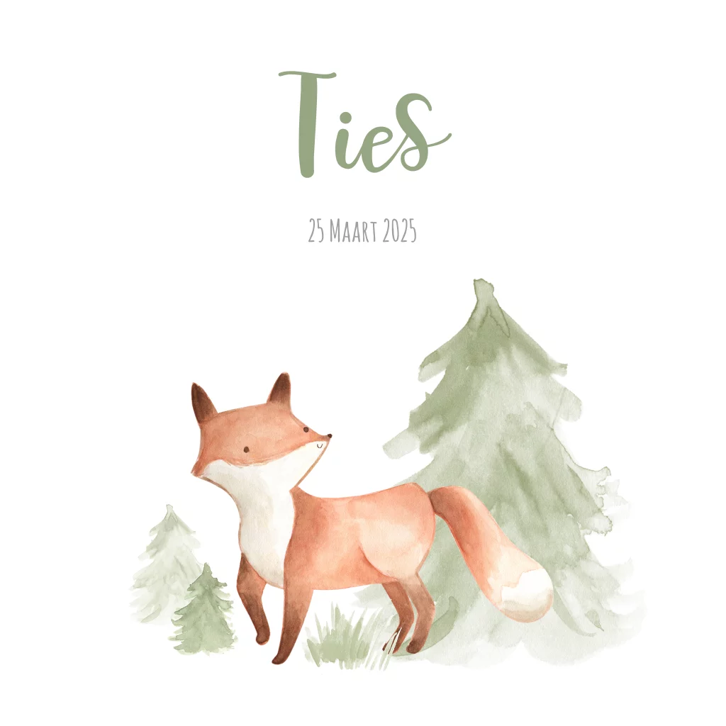 Lief geboortekaartje voor een jongen! Speciaal aan dit kaartje is het vosje dat vaker terug komt op de kaart. Met bomen en bloemenkrans in waterverf!