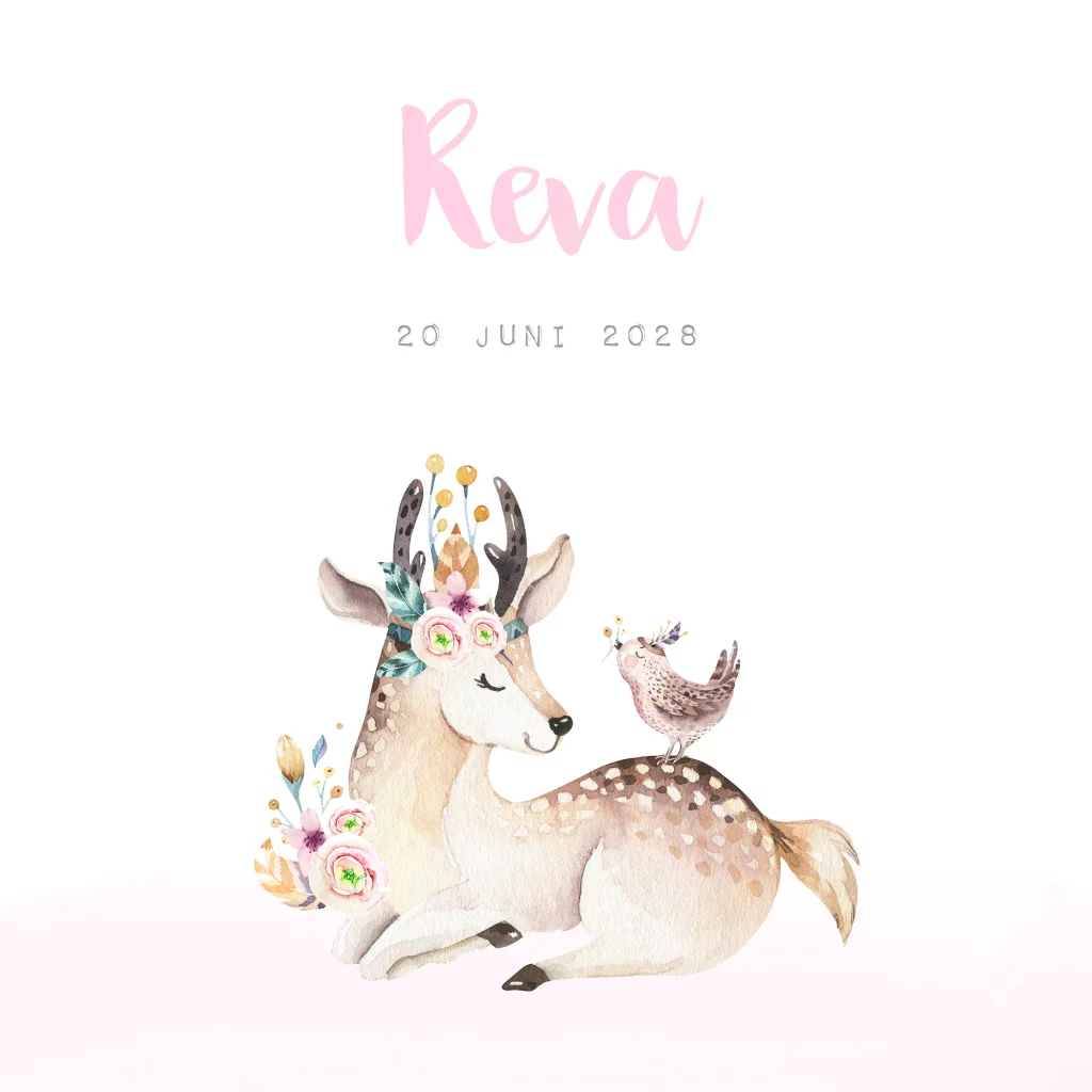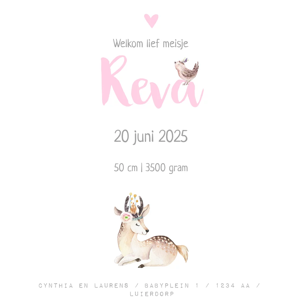 Lief geboortekaartje met hertje, vogeltjes en bloemetjes! In roze tinten en met aquarel.