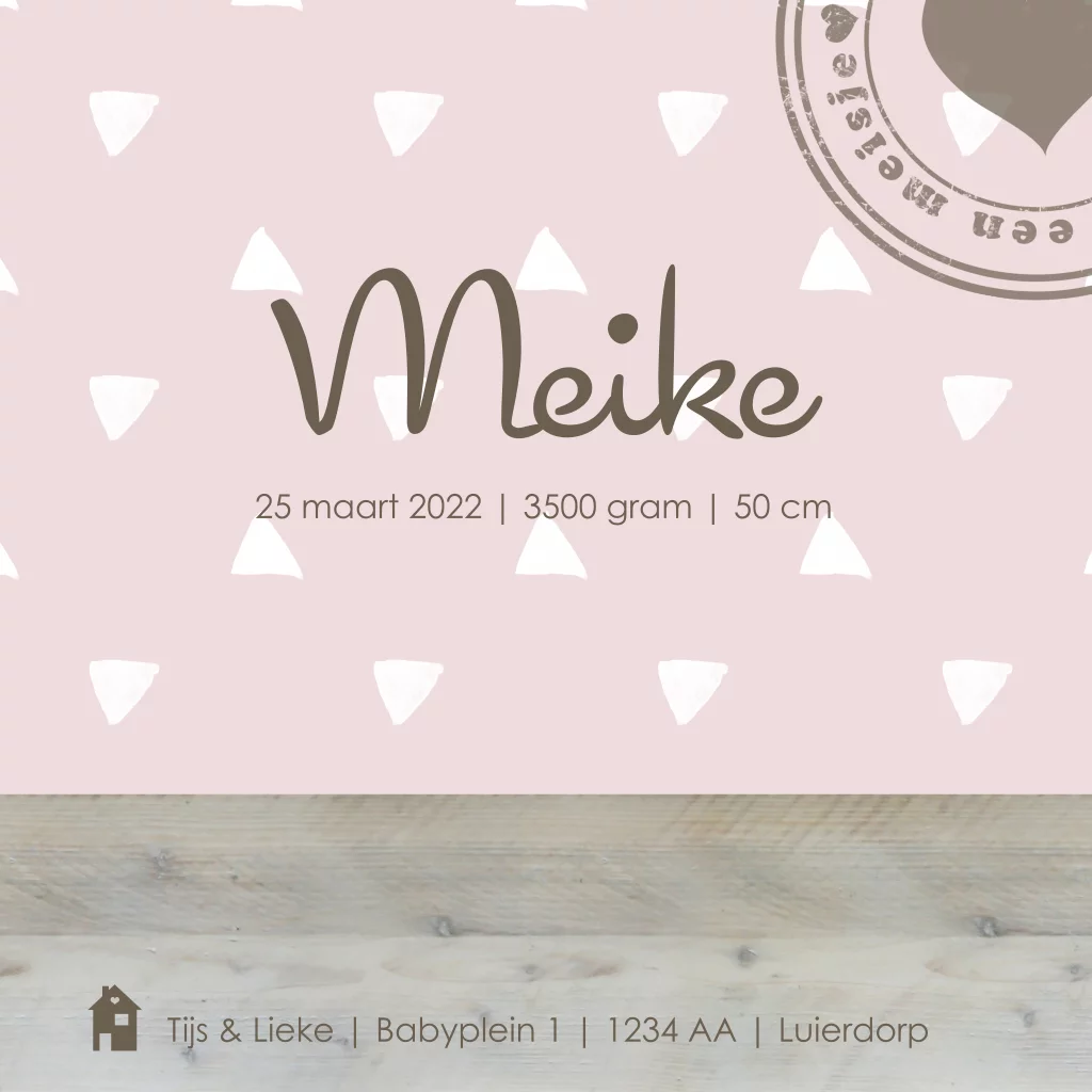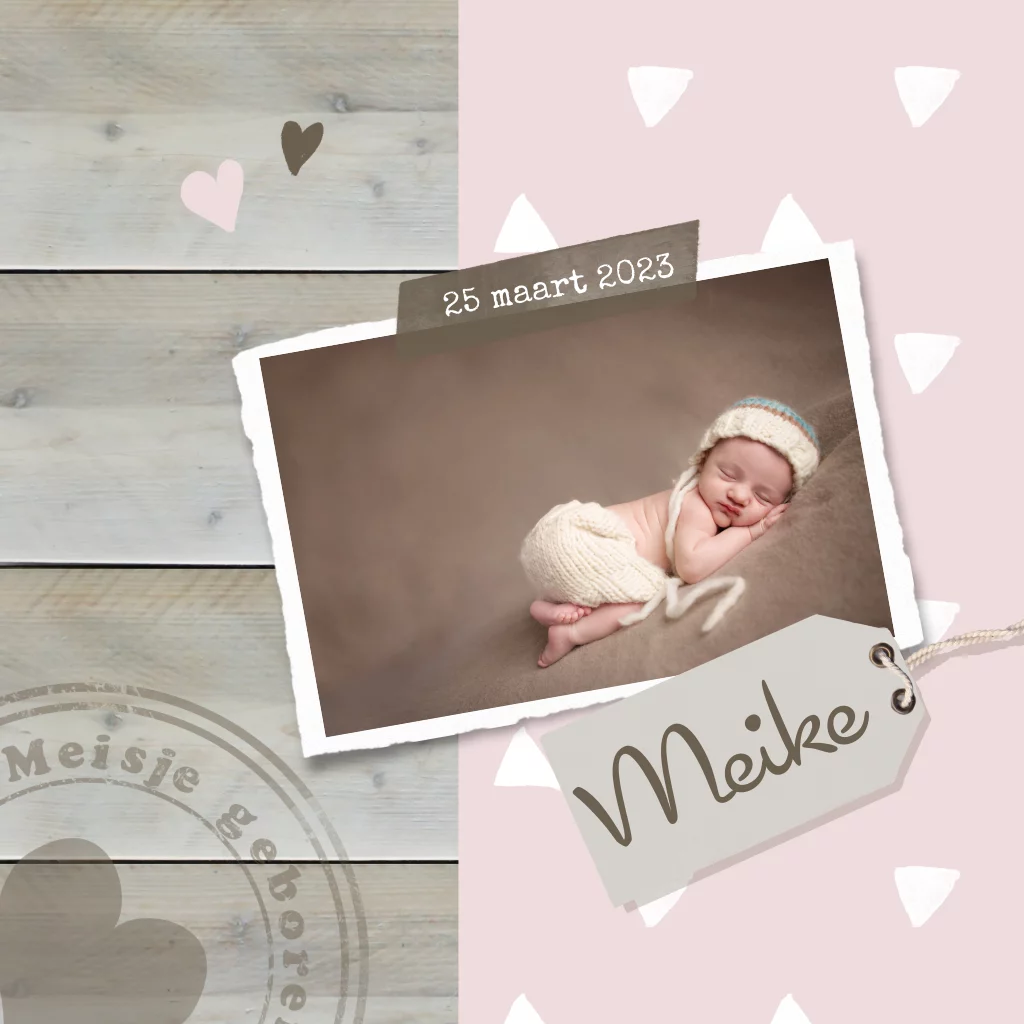 Meisjes geboortekaartje met whitewash hout, eigen foto, driehoekjes achtergrond, pastel roze, label, stempel en hartjes.