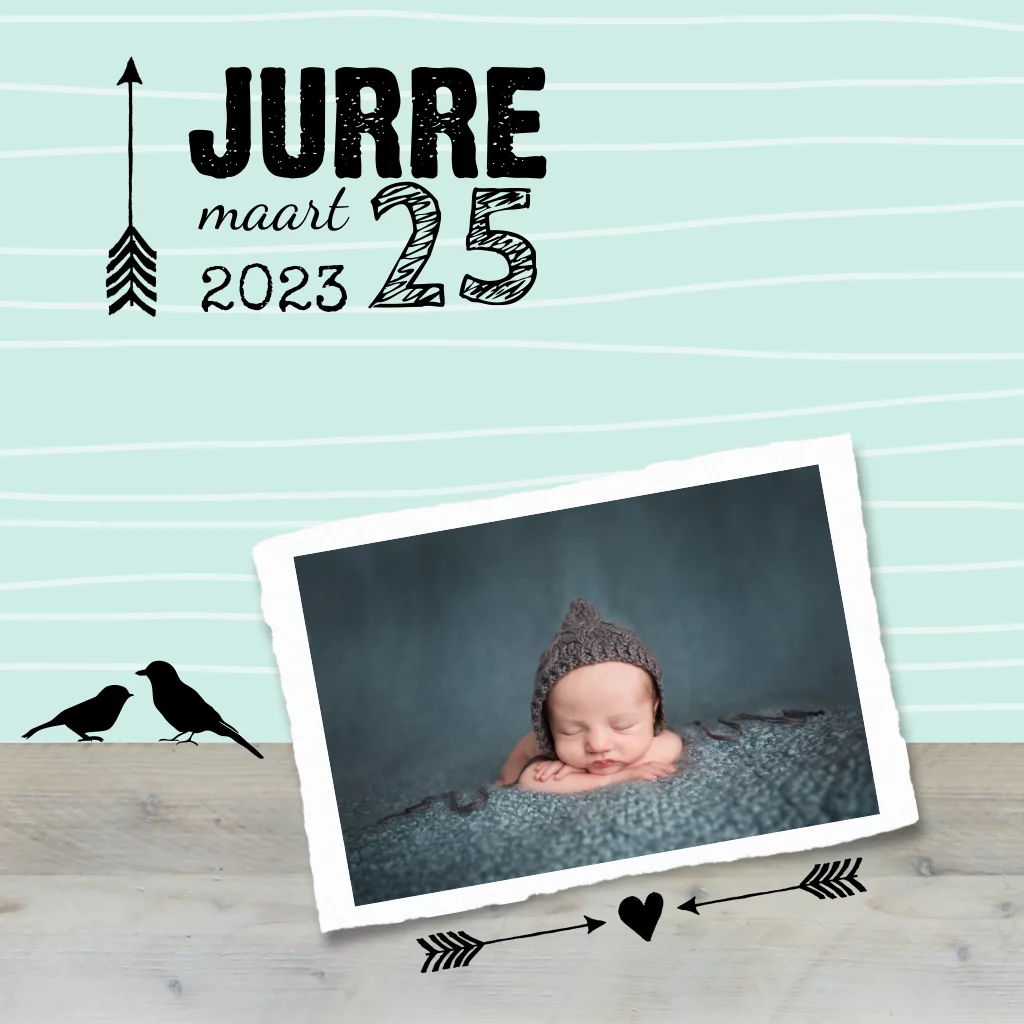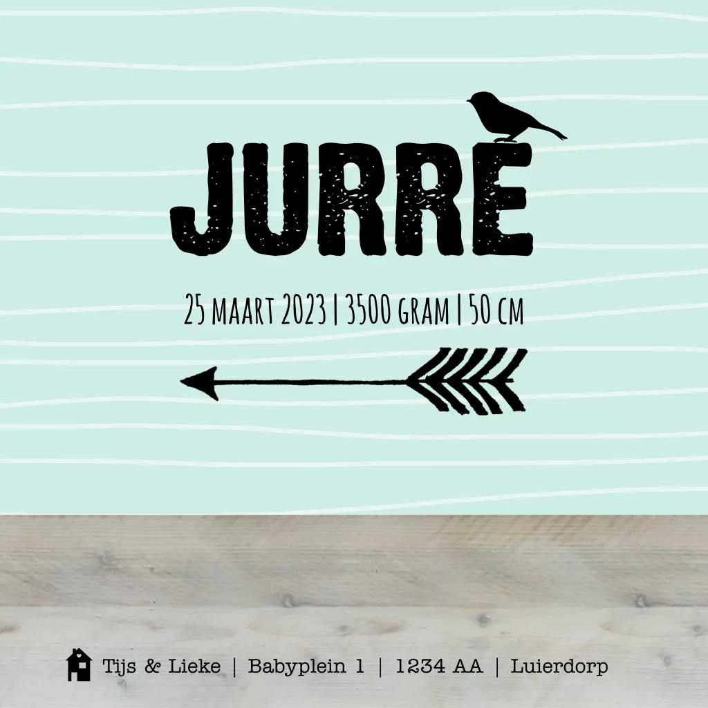 Jongens geboortekaart met stoere pijlen, lief mint, trendy vogeltjes en steigerhout. Op de voorkant kan je je eigen foto plaatsen.