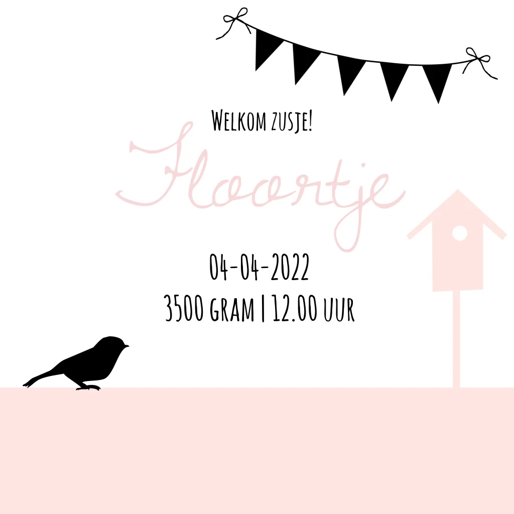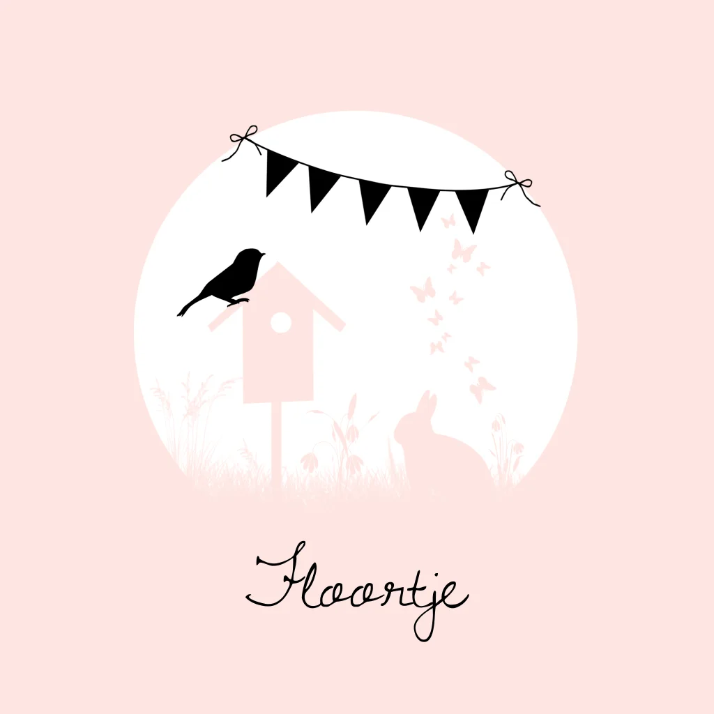 Hip en lief geboortekaartje voor een meisje in zwart wit en roze. Met silhouet van gras, bloemen, vlinders, konijntje, vogel, vogelhuisje en slingers.