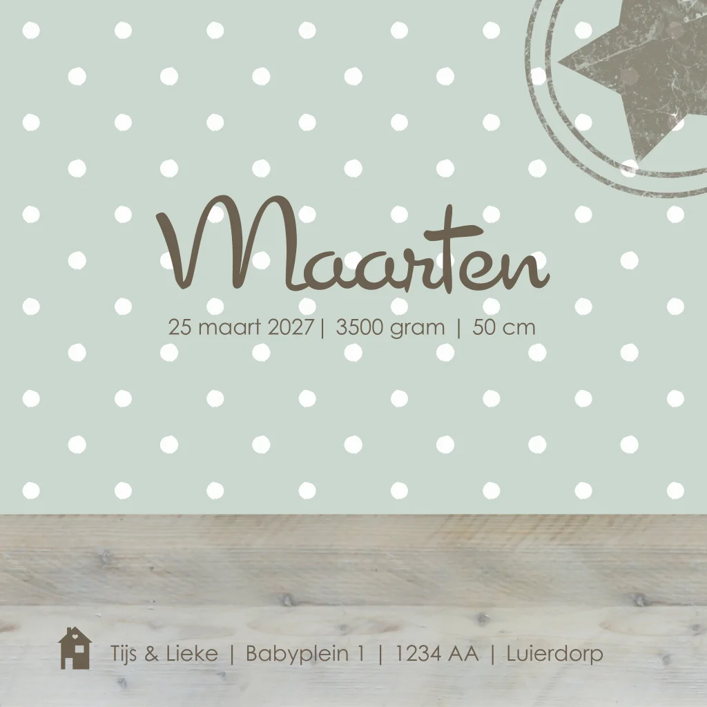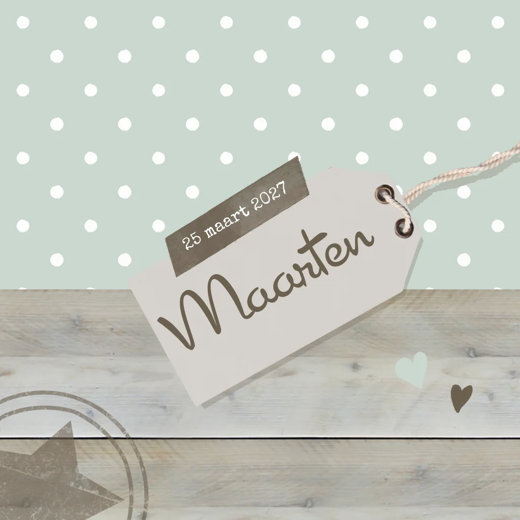 Lief geboortekaartje voor een jongen met pastel groen en hout met stipjes, stempel, hartjes, label en tape.