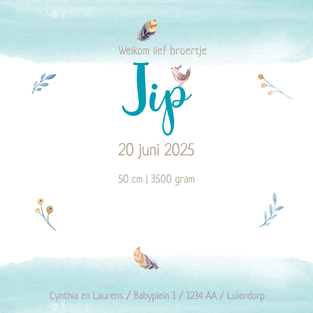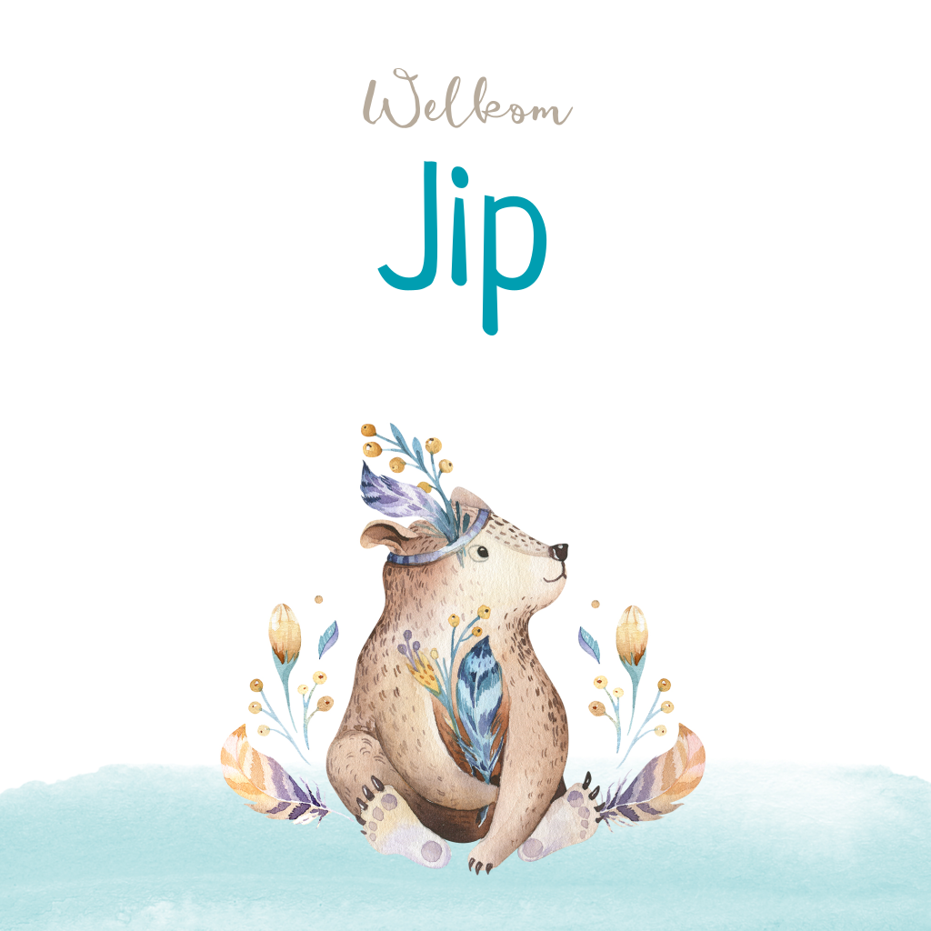 Een vrolijk en stijlvol kaartje voor een jongen! Met verschillende kleuren, veertjes, bloemen, vogeltjes en een beertje op de voorkant. Het kaartje heeft mooie kleurencombinaties en is in aquarel.