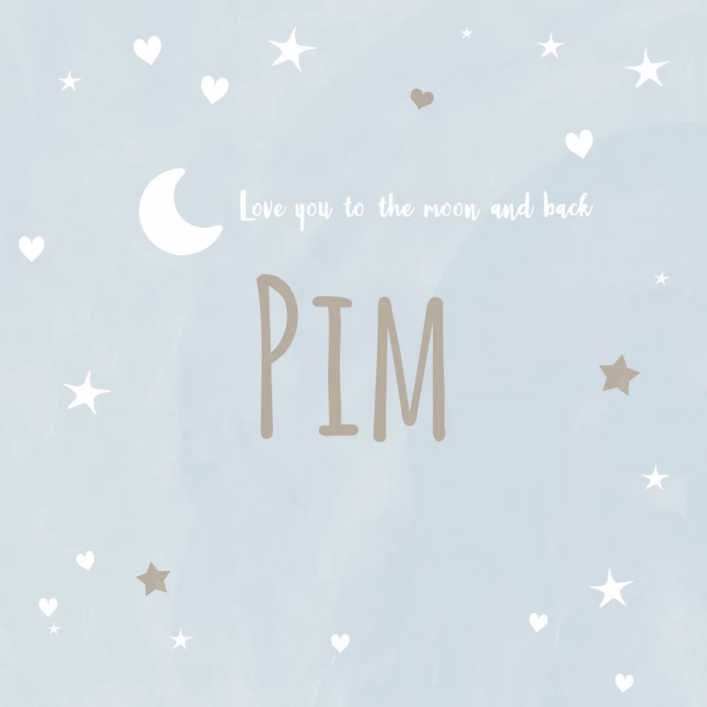 Jongens geboortekaartje met waterverf achtergrond, sterretjes, hartjes, maan en de tekst "Love you to the moon and back"