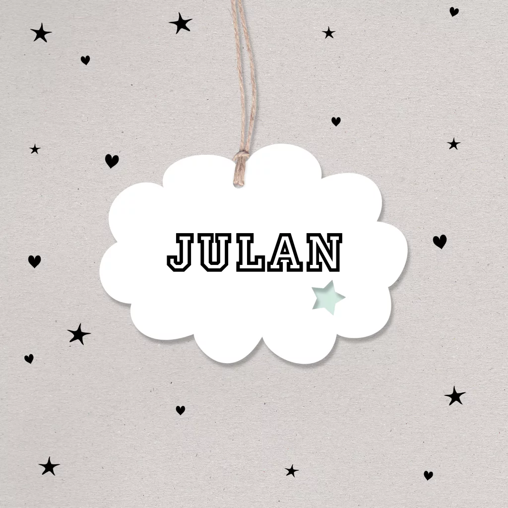 Lieve geboortekaart op grijs karton met wolkjes label, zwarte sterretjes en hartjes.