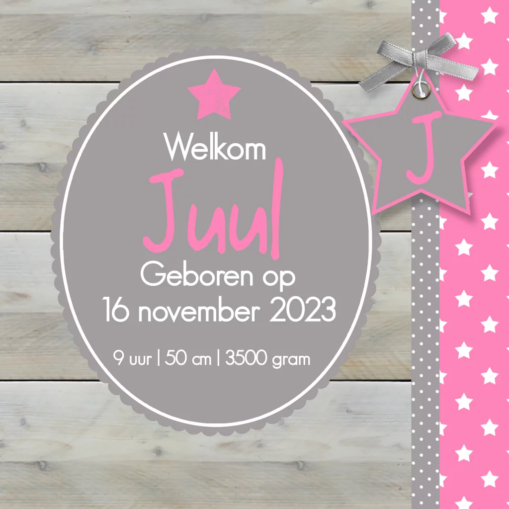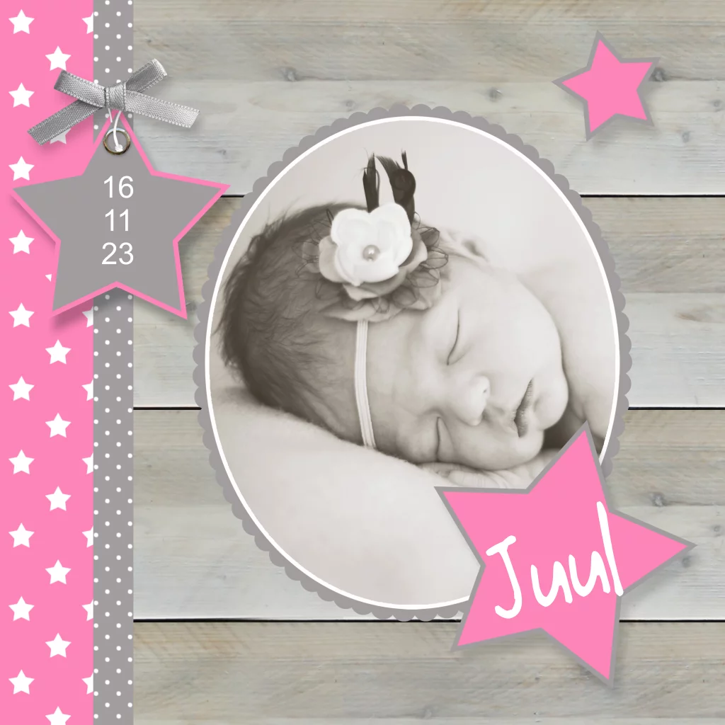 Geboortekaartje voor een meisje met roze, steigerhout, sterren en foto. Met een stoer lettertype maak je dit kaartje af.