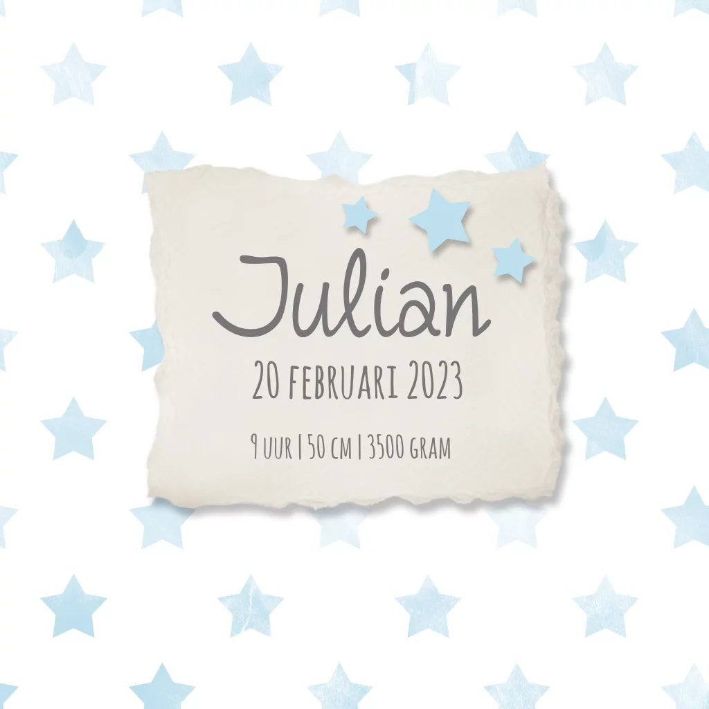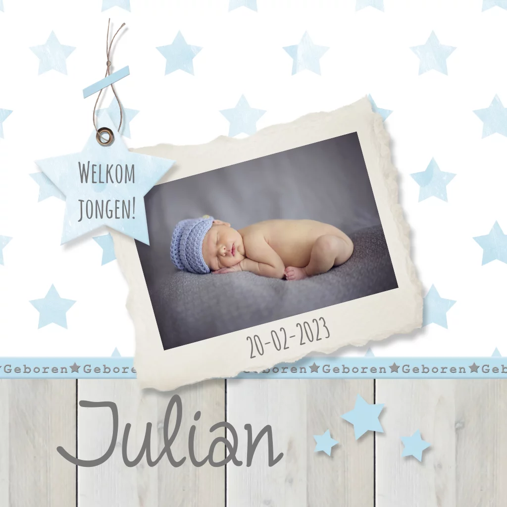Voeg je eigen foto toe aan dit lieve geboortekaartje voor een jongen. Met een achtergrond van hout en sterren en een label in stervorm.