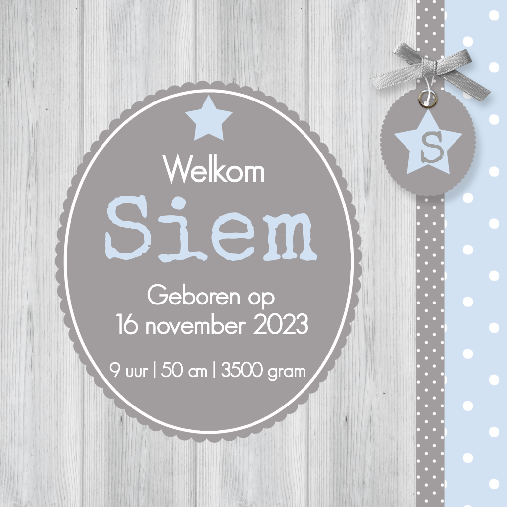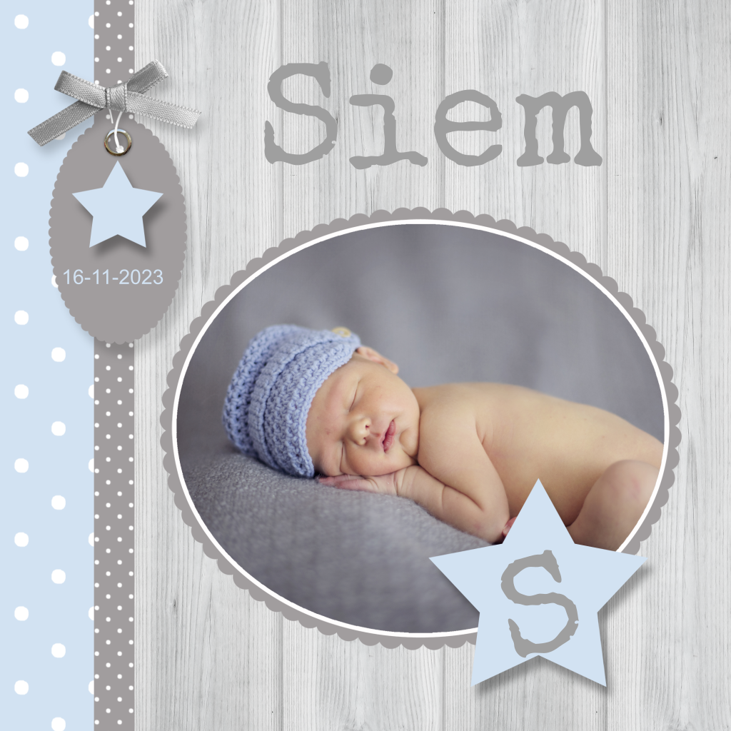 Hip kaartje voor een jongen met hout, eigen foto, stoere sterretjes, lichtblauw, stipjes en label.