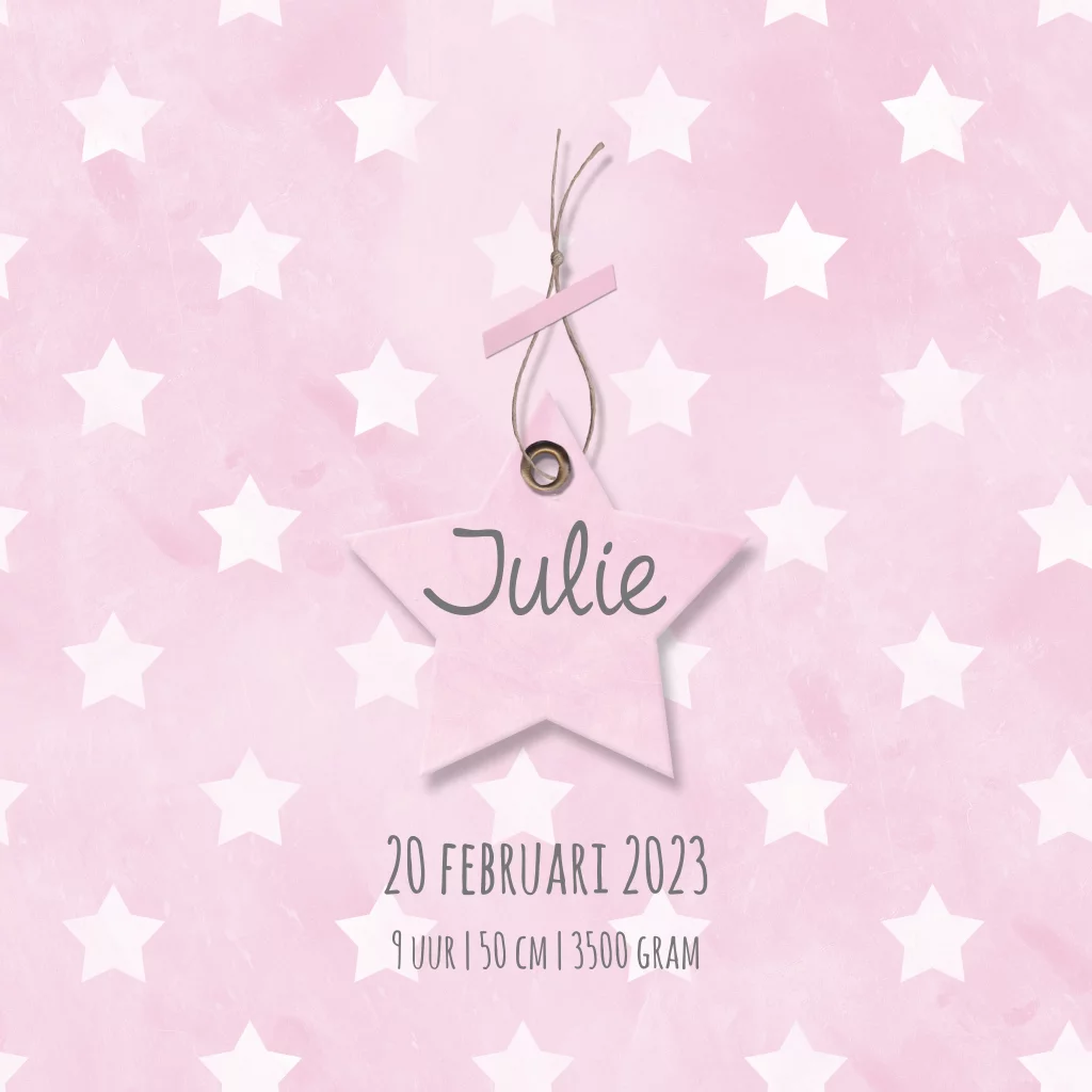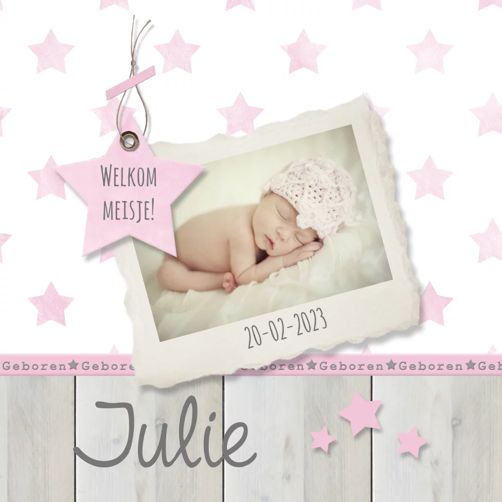 Geboortekaartje voor een meisje met lieve roze sterretjes, hout, label en een gescheurd papiertje om een foto op te plaatsen.
