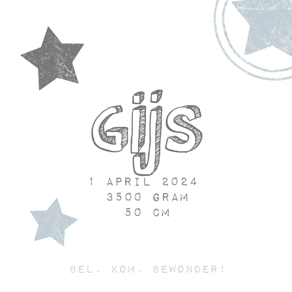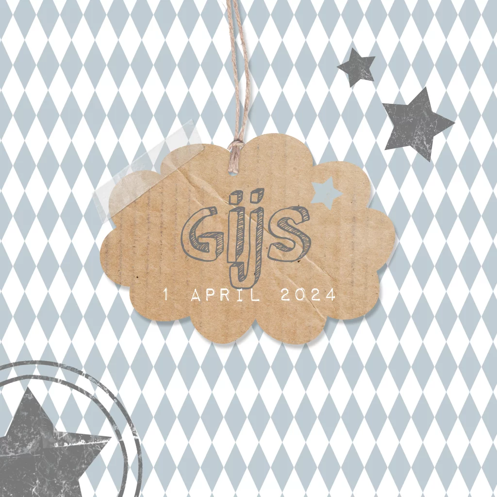 Super hip geboortekaartje met grijs blauw ruitjespatroon, sterren en een wolkjes label van karton.