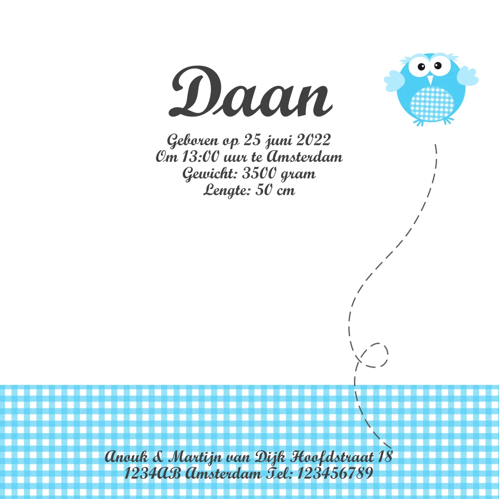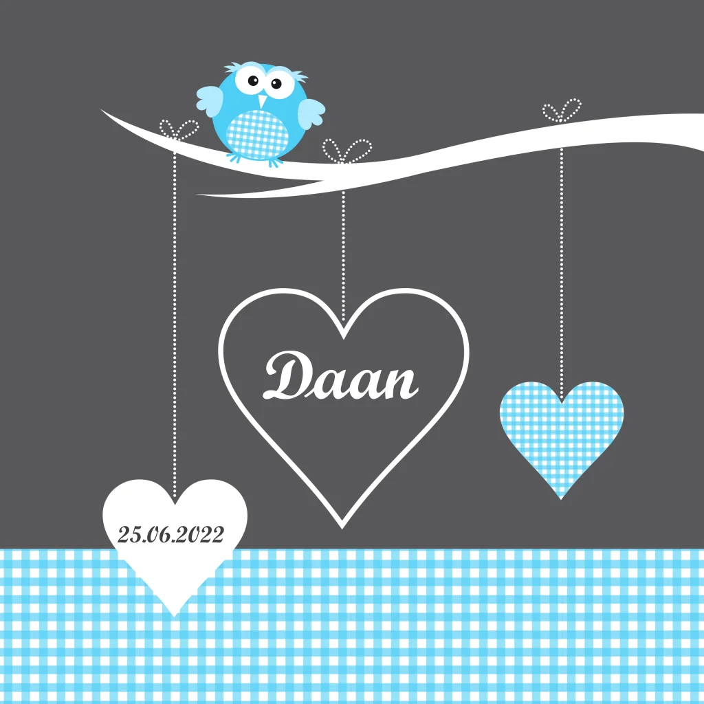 Een schattig geboortekaartje voor een jongen met een ruiten, open en wit hartje. Plus een grappig uiltje.