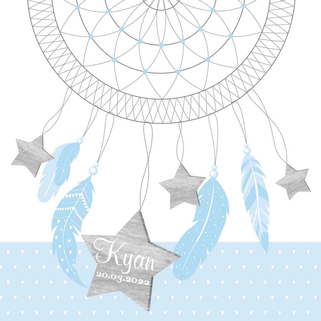 Geboortekaart voor een jongen. Een rustige blauwe dromenvanger met veren en sterren.