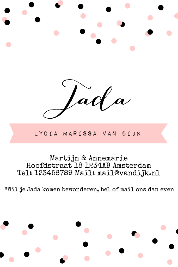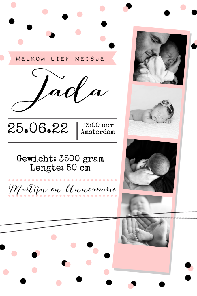 Hippe babykaart met vier foto's op een fotostrip voor een meisje. Hip met de zwart roze confetti en banner.