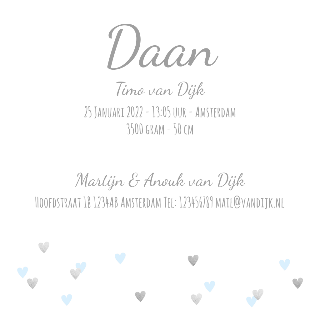 Een lief en hip geboortekaartje met hartjes en een foto voor een jongen. Vervang zelf de foto en pas de teksten aan.