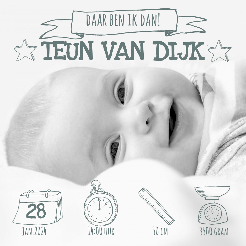 Stoer foto geboortekaartje met icoontjes en eigen grote foto