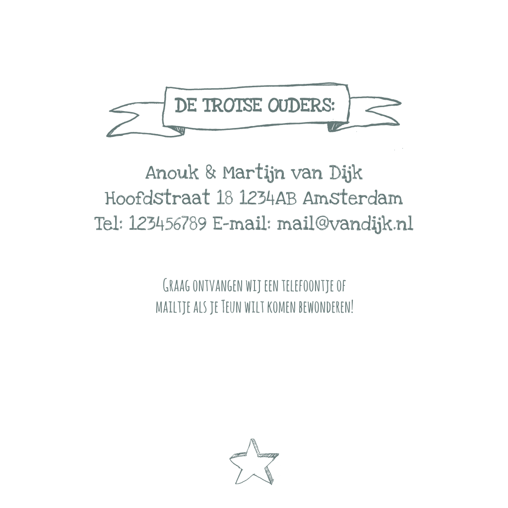 Een stoer en hip geboortekaartje met leuke getekende icoontjes, voor een jongen. Je kunt zelf je achtergrondfoto uploaden en de teksten aanpassen. Ook kun je van alle onderdelen het formaat en de kleur aanpassen. Draai de wijzertjes van de klok zelf naar de tijd van de geboorte.