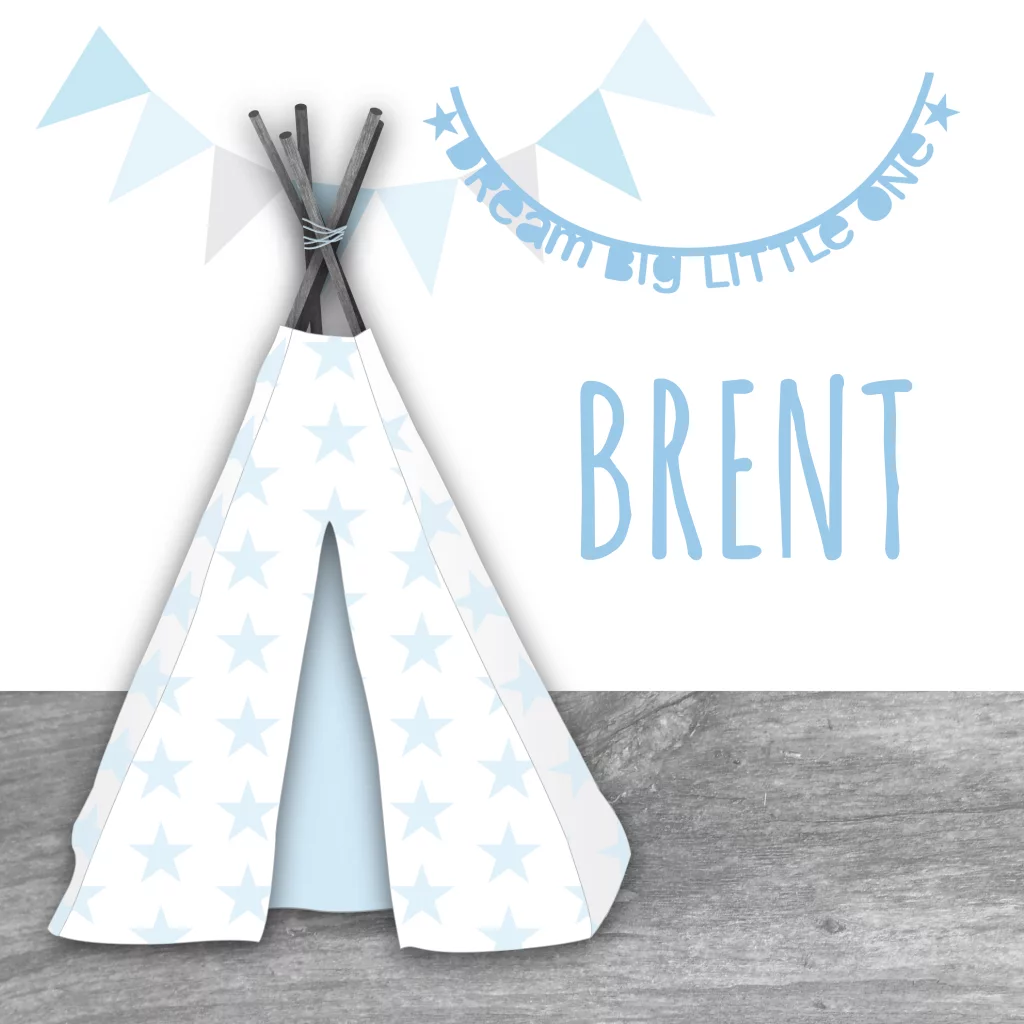Een leuk, hip geboortekaartje met een tipi, houtprint, letterslinger en sterren voor een jongen.