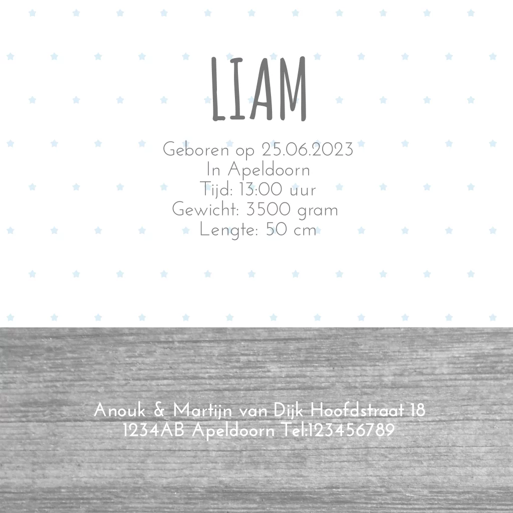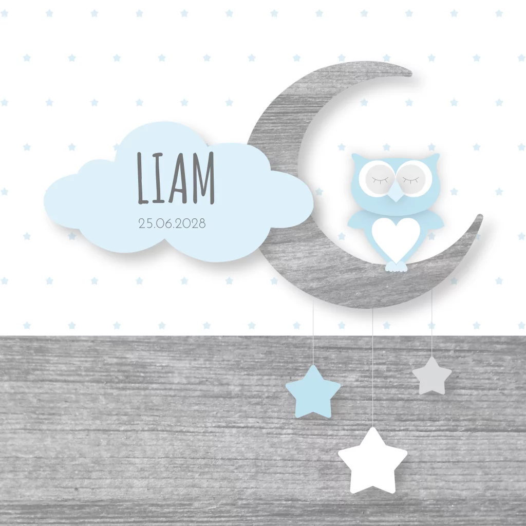 Een mooi en hip geboortekaartje met een uiltje, maan, sterren en houtlook. Pas zelf de teksten aan. De losse onderdelen kun je verschuiven en vergroten of verkleinen.