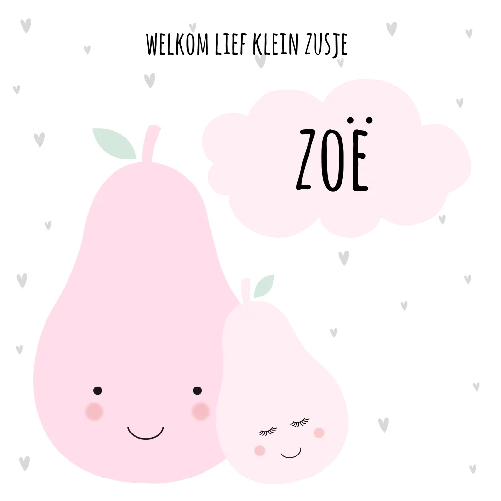 Een schattig en hip geboortekaartje met peertjes in lieve pasteltinten voor de geboorte van een zusje. Pas zelf de teksten aan.