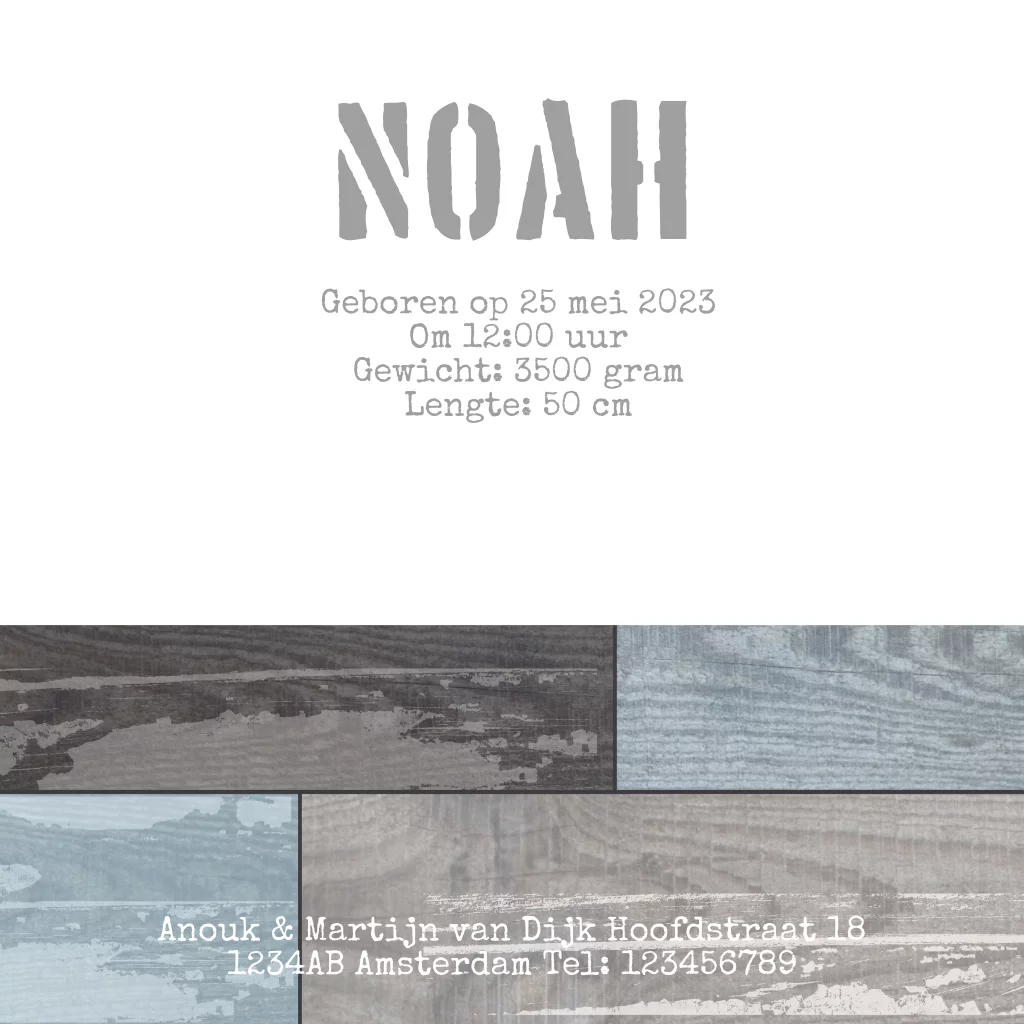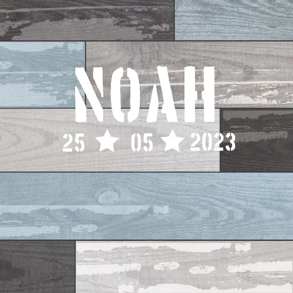 Een hip geboortekaartje met houtprint voor een jongetje. Alle teksten zijn zelf aan te passen.