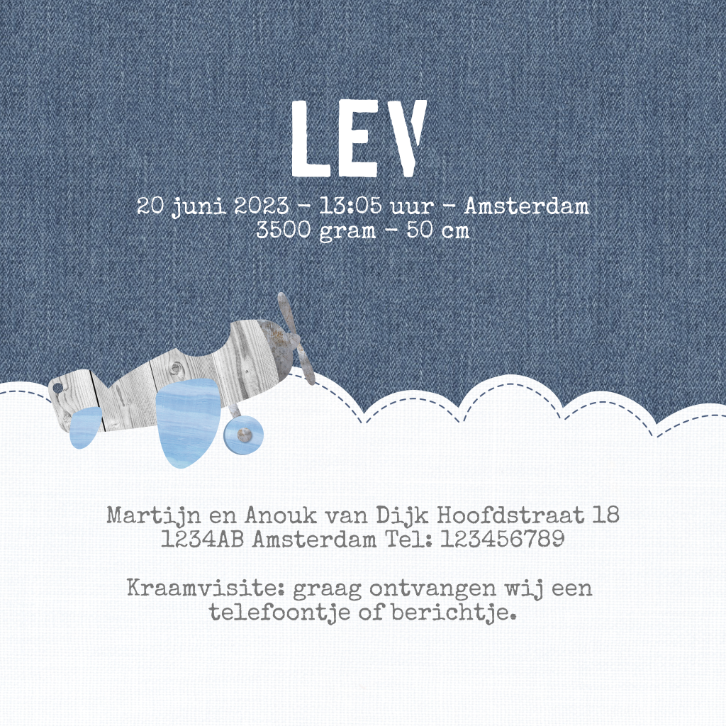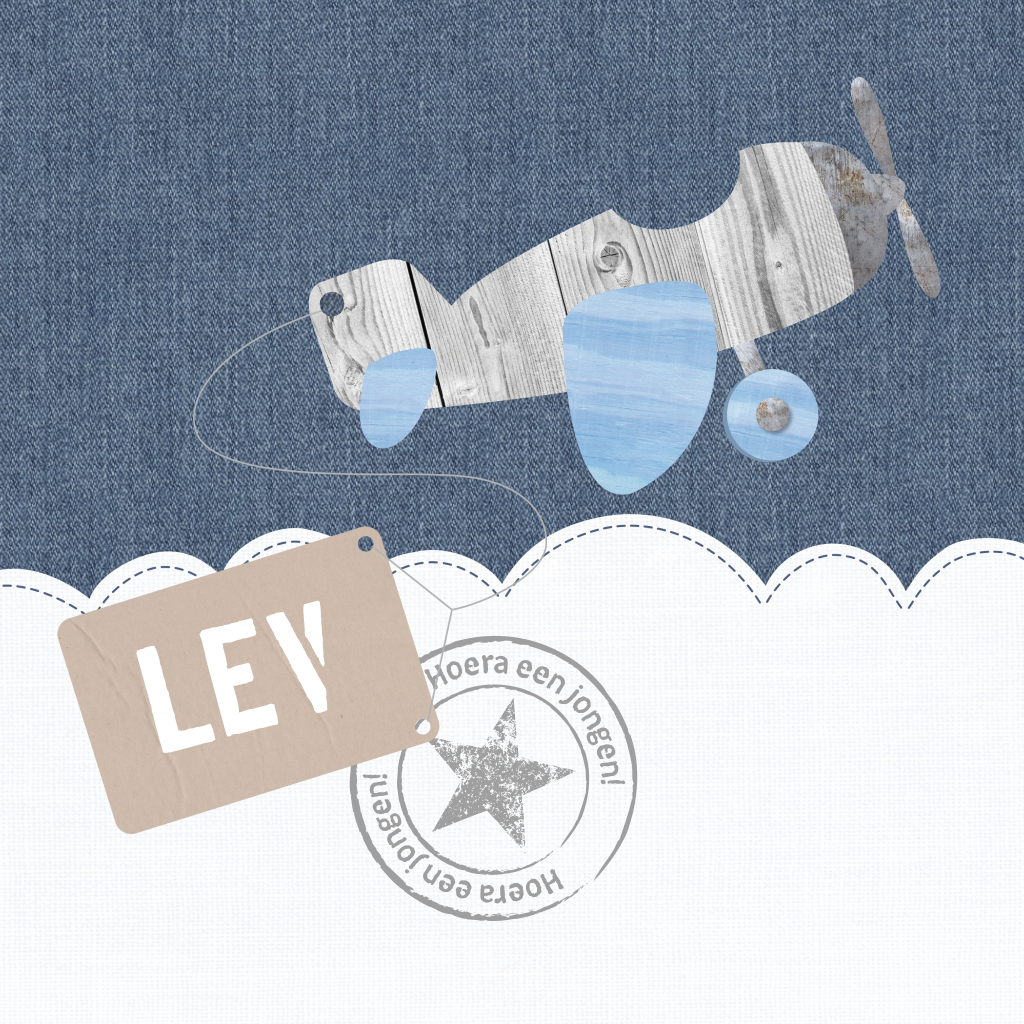 Stoer geboortekaartje met vliegtuig van hout en watercolour. De leuke label en stempel staan op de wolken.