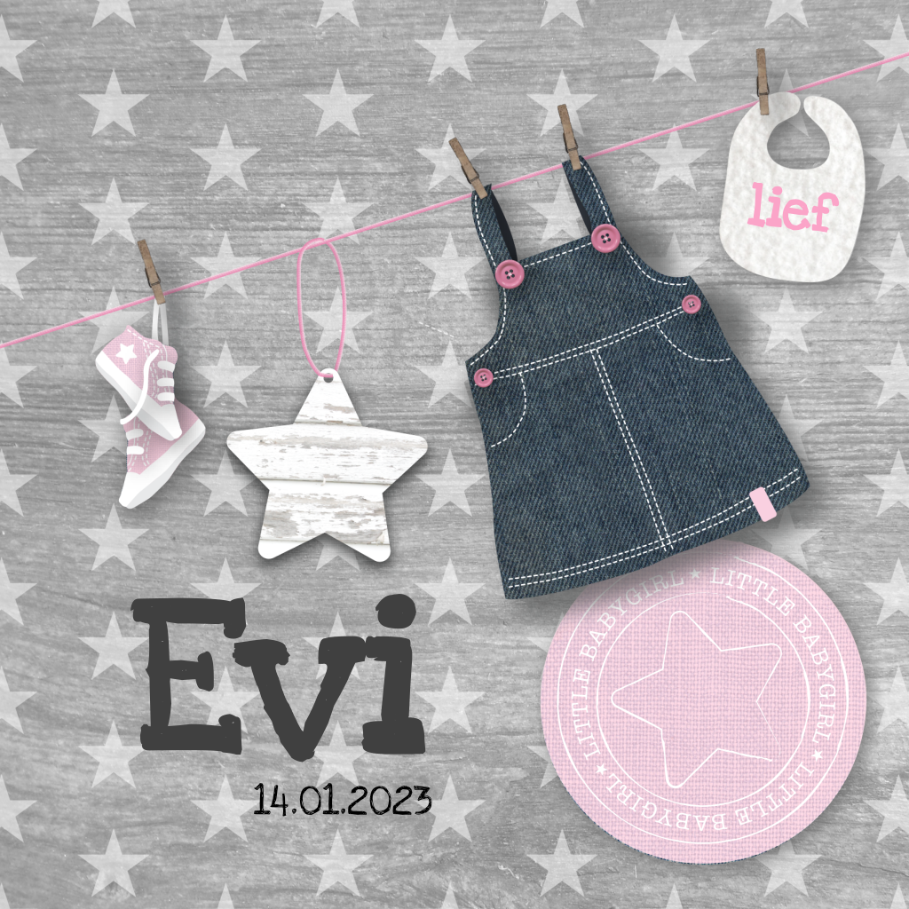 Een lief en stoer geboortekaartje met een waslijn, sterren en houtprint voor een meisje! De meeste teksten zijn zelf aan te passen. Ook kun je de losse onderdelen verschuiven en vergroten of verkleinen.