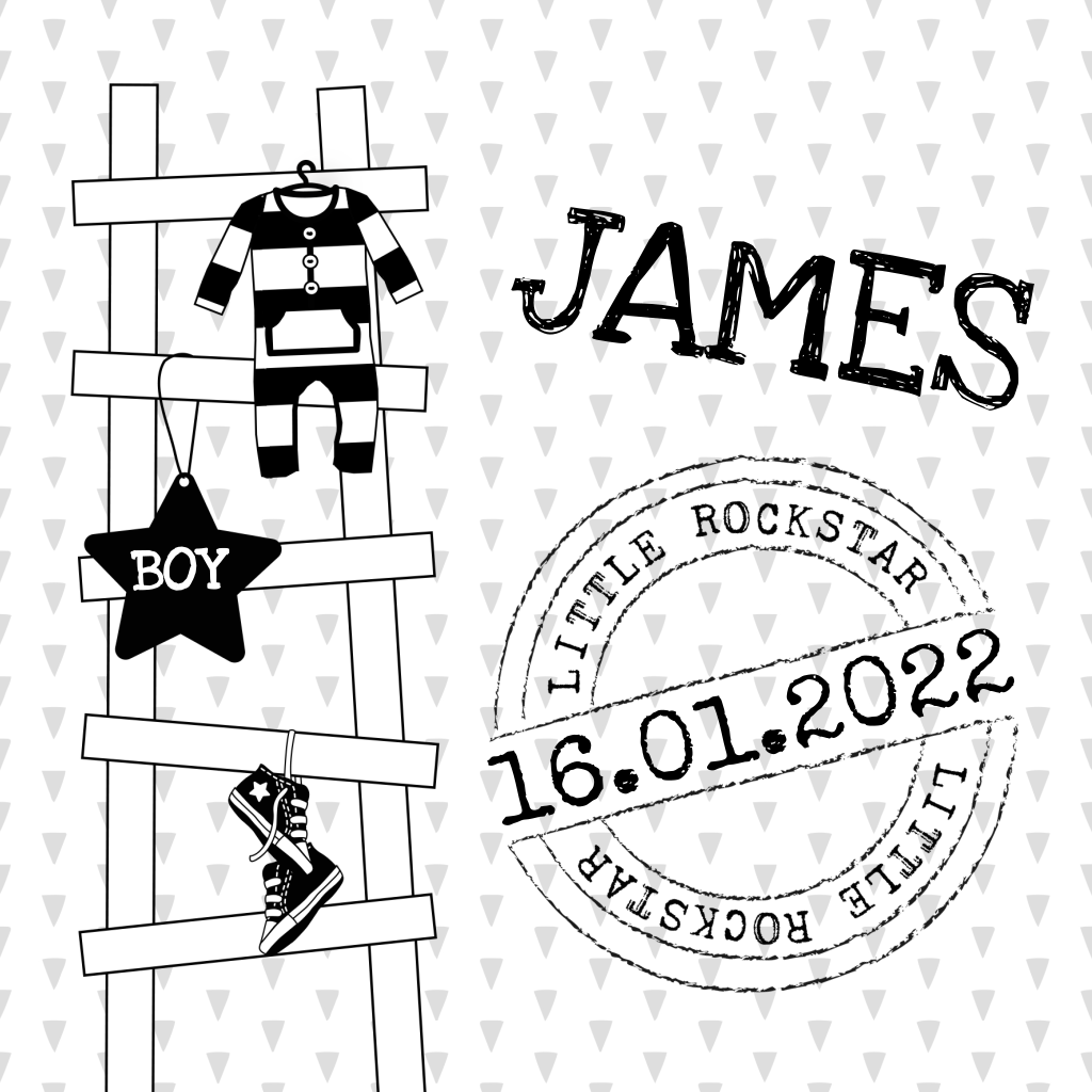 Een stoer en hip geboortekaartje in zwart-wit met ladder, sneakers en leuke stempel met tekst Little Rockstar.