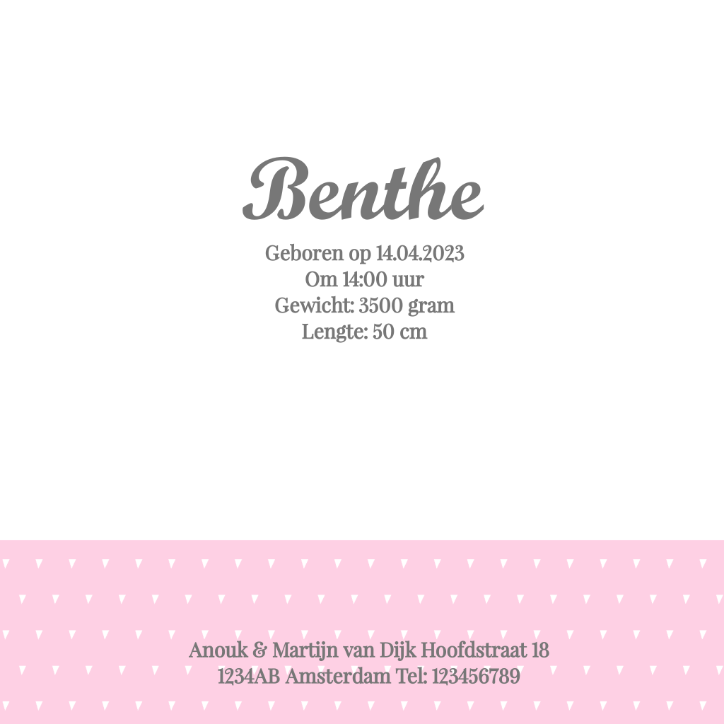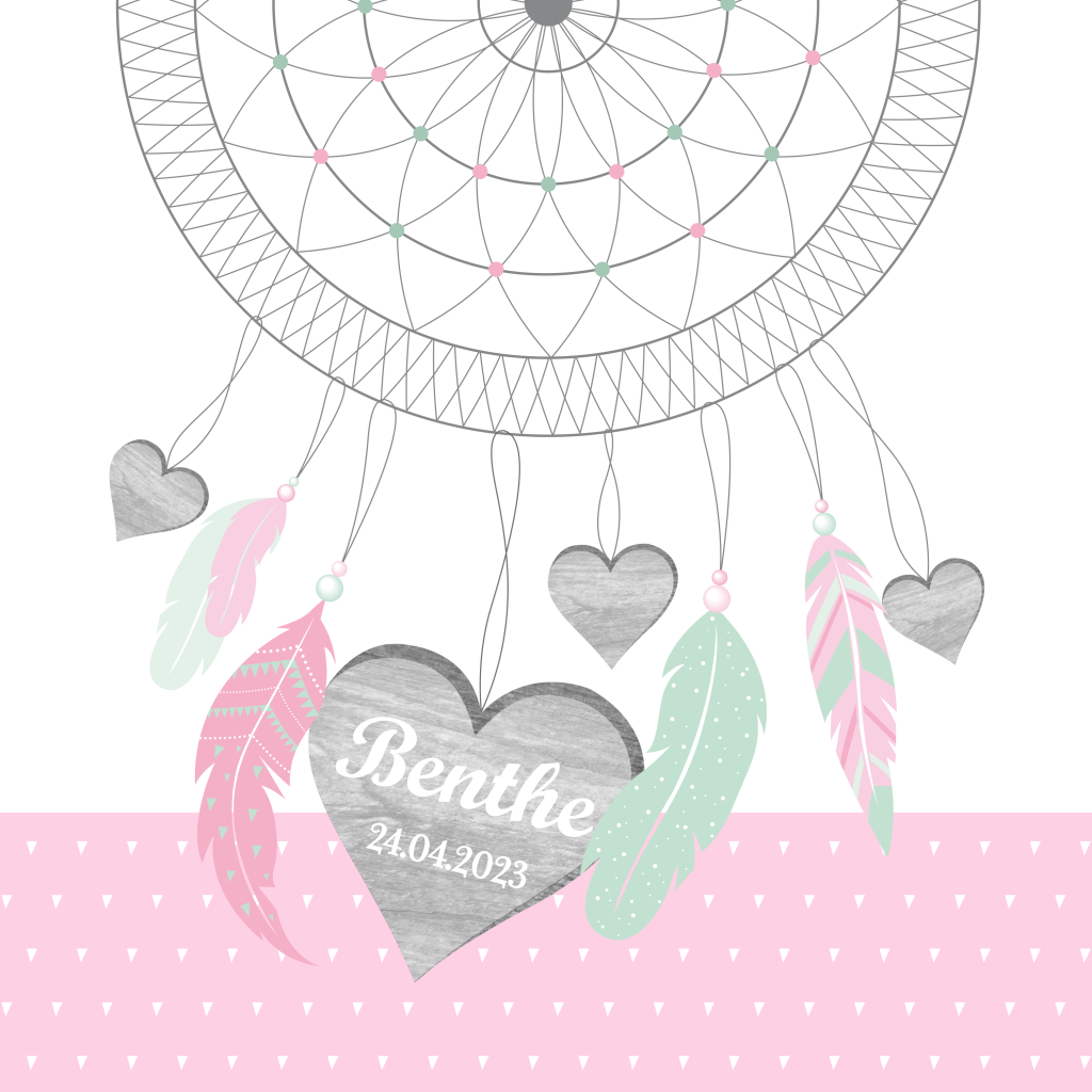 Een mooi en lief geboortekaartje voor een meisje met een dromenvanger voor een meisje. Pas zelf de teksten en kleuren aan. De losse elementen kun je verschuiven en vergroten of verkleinen.