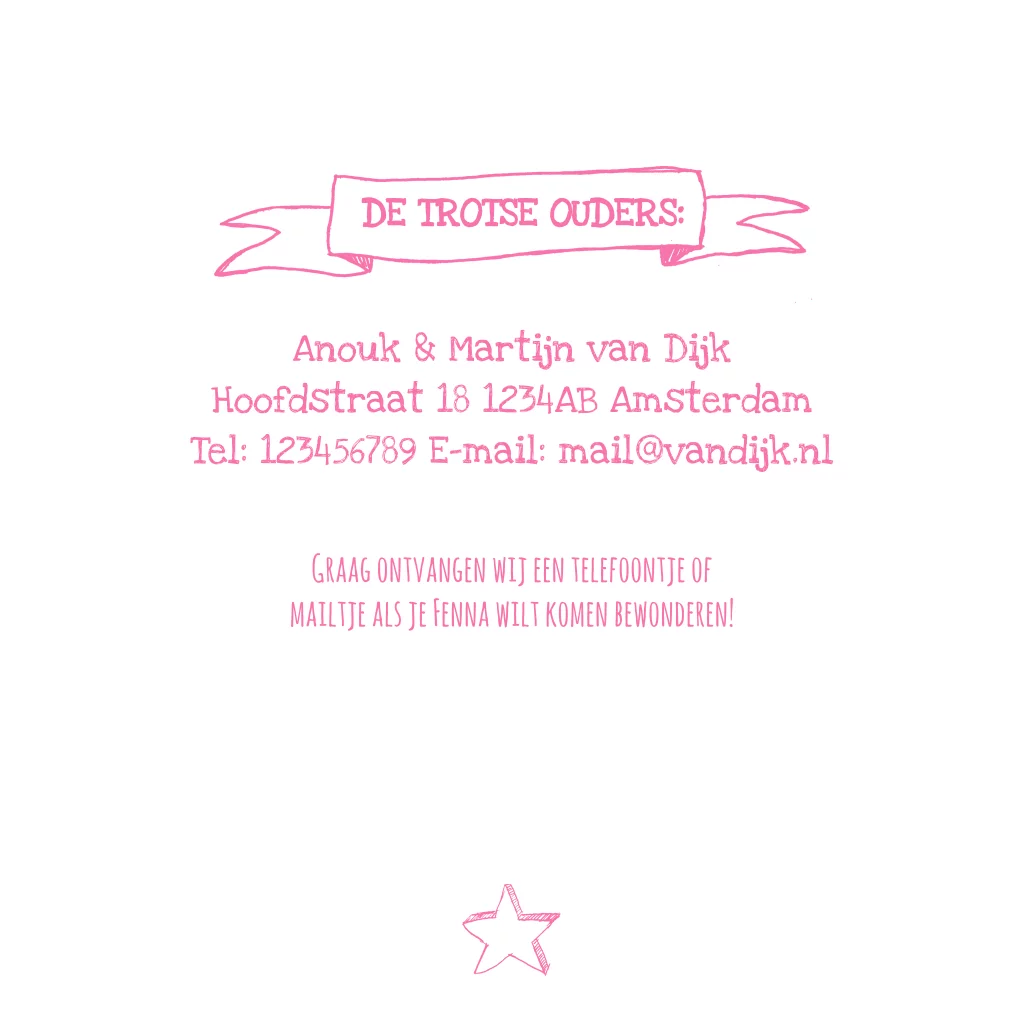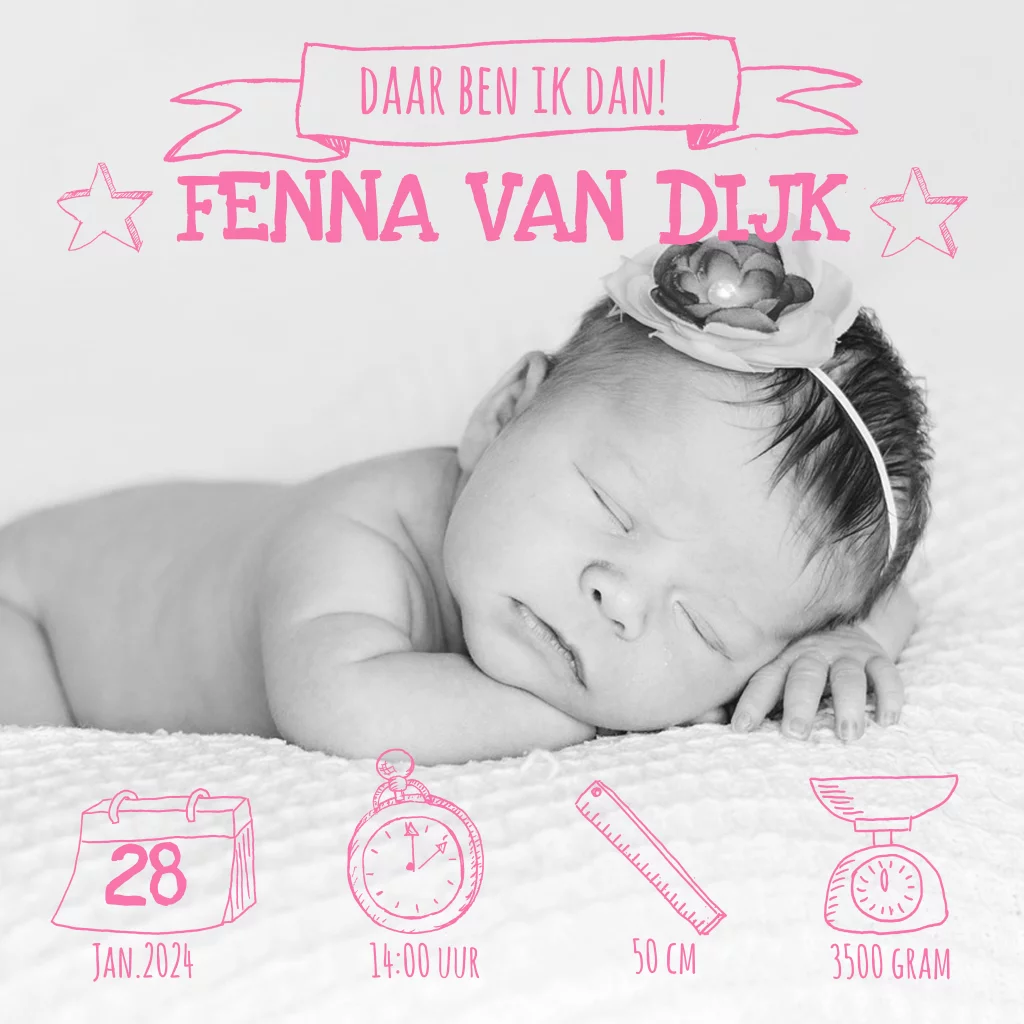 Een stoer en hip geboortekaartje met handlettering en leuke illustraties, voor een meisje. Draai de wijzertjes van de klok zelf naar de tijd van de geboorte.