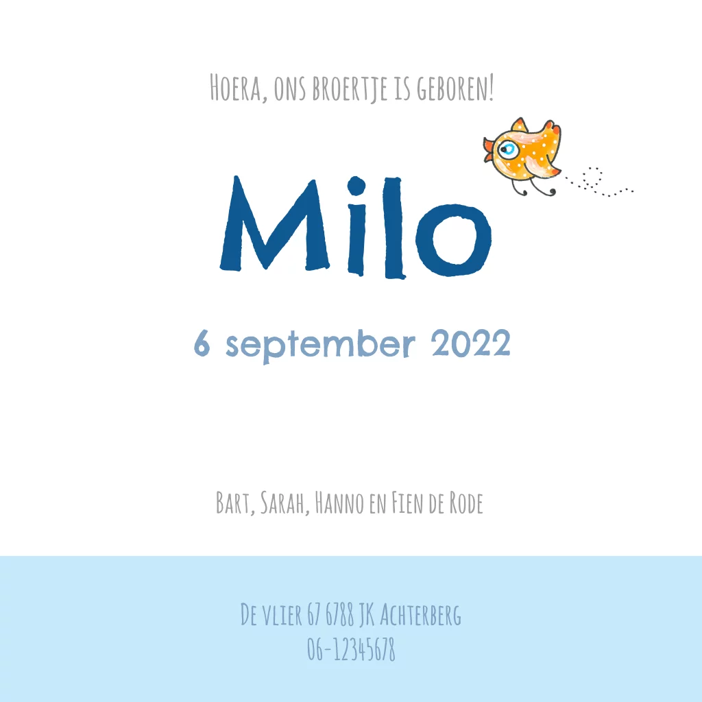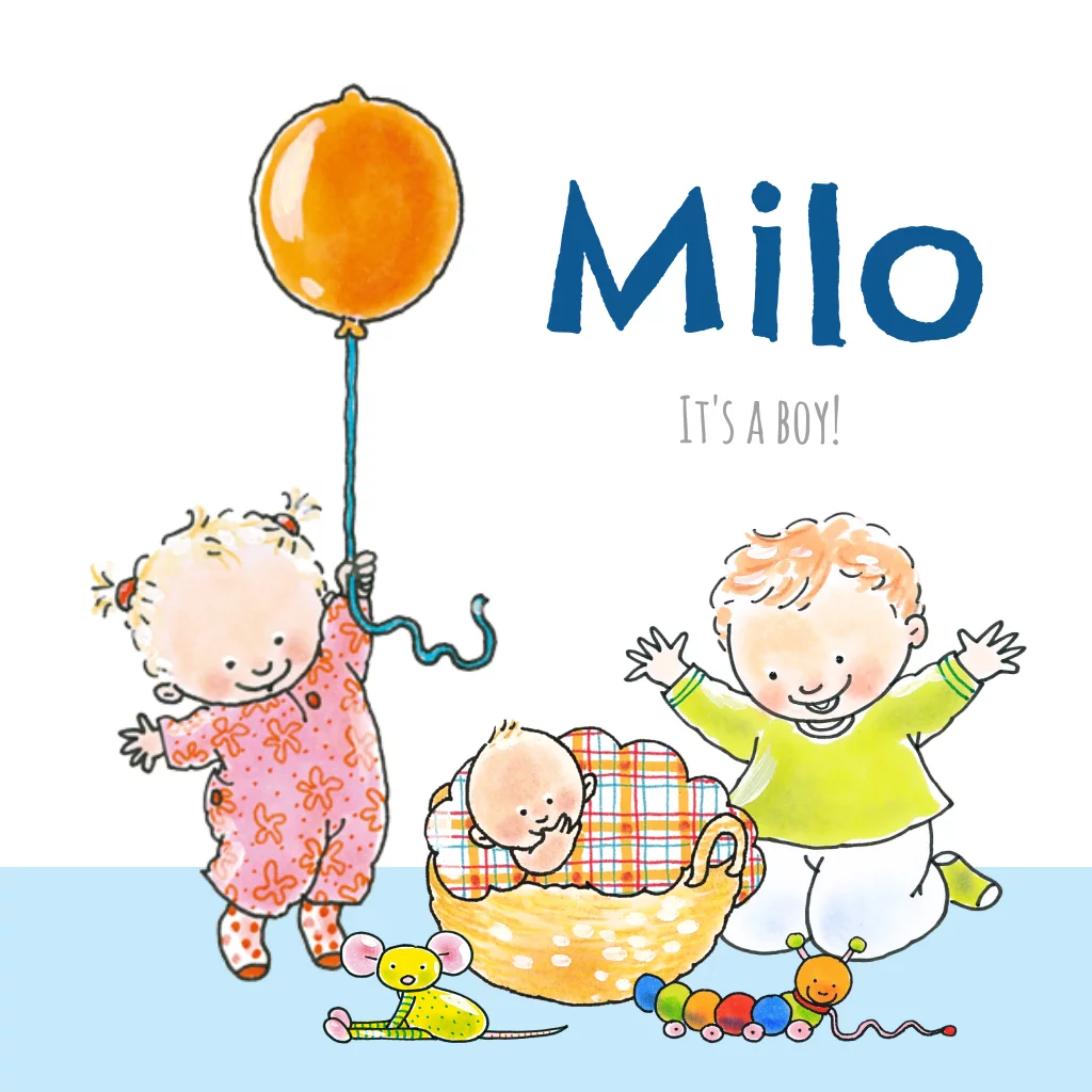 Gefeliciteerd met je jongen. Wat een verrijking van het gezin. In dit schattige geboortekaartje zie je een grote broer een zusje en de baby in de wieg. Heb je ook de leuke slinger gezien?