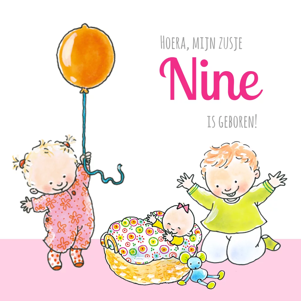 Wil je een origineel geboortekaartje voor de geboorte van je derde kind? Pauline Oud maakt allerlei geboortekaartje met verschillende gezinssamenstellingen. Hier zie je de baby in een mandje met een zus en een broer. Aan de binnenkant hangen de vlaggetjes op.