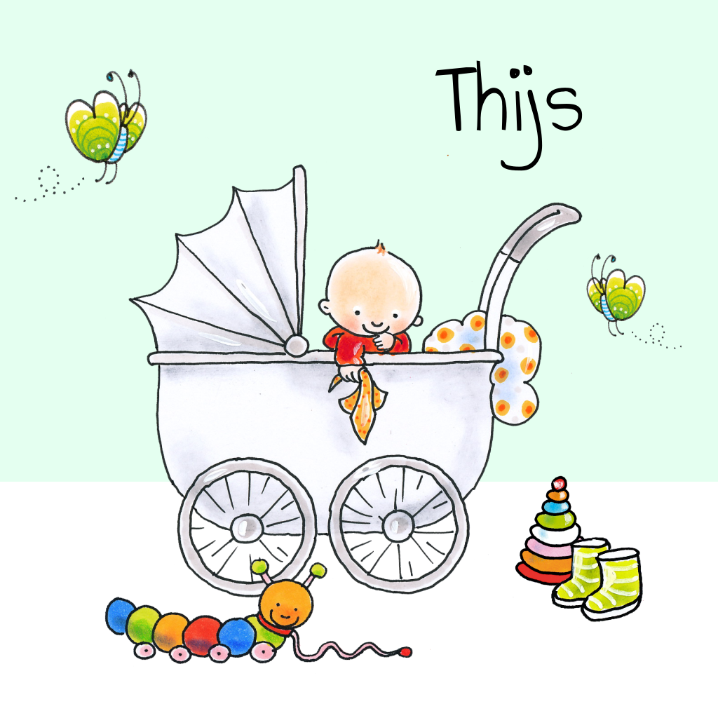 Ben jij fan van Pauline Oud? Dit geboortekaartje past goed bij haar illustraties en boeken. Het jongetje in de kinderwagen kijkt vrolijk naar zijn speelgoed en laarsjes, terwijl de vlinders om hem heen vliegen.