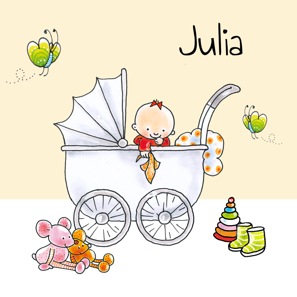 Vrolijk geboortekaartje met kinderwagen door Pauline Oud