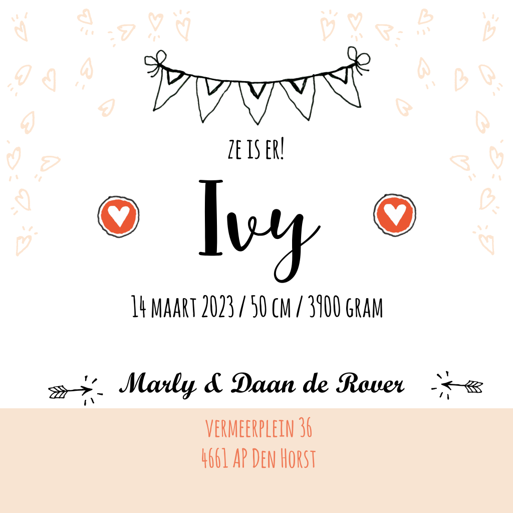 Lief geboortekaartje voor meisje bladerkrans op hartjes patroon