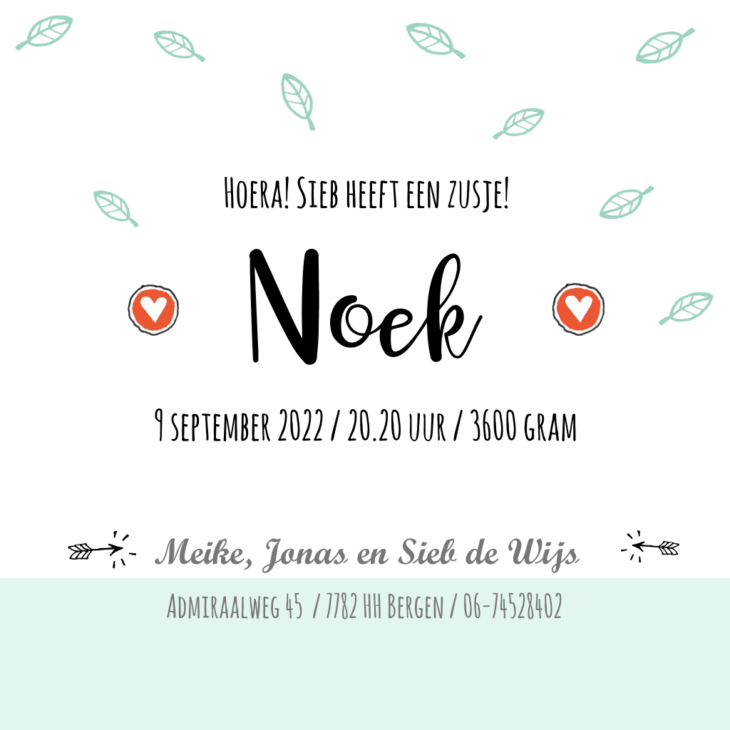 Schattig kaartje om de geboorte van je dochter aan te kondigen. Mintgroen met stipjes patroon, hartjes en tekening van een baby zusje in een karretje samen met haar grote broer.