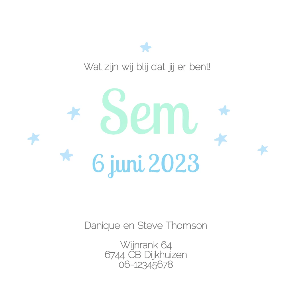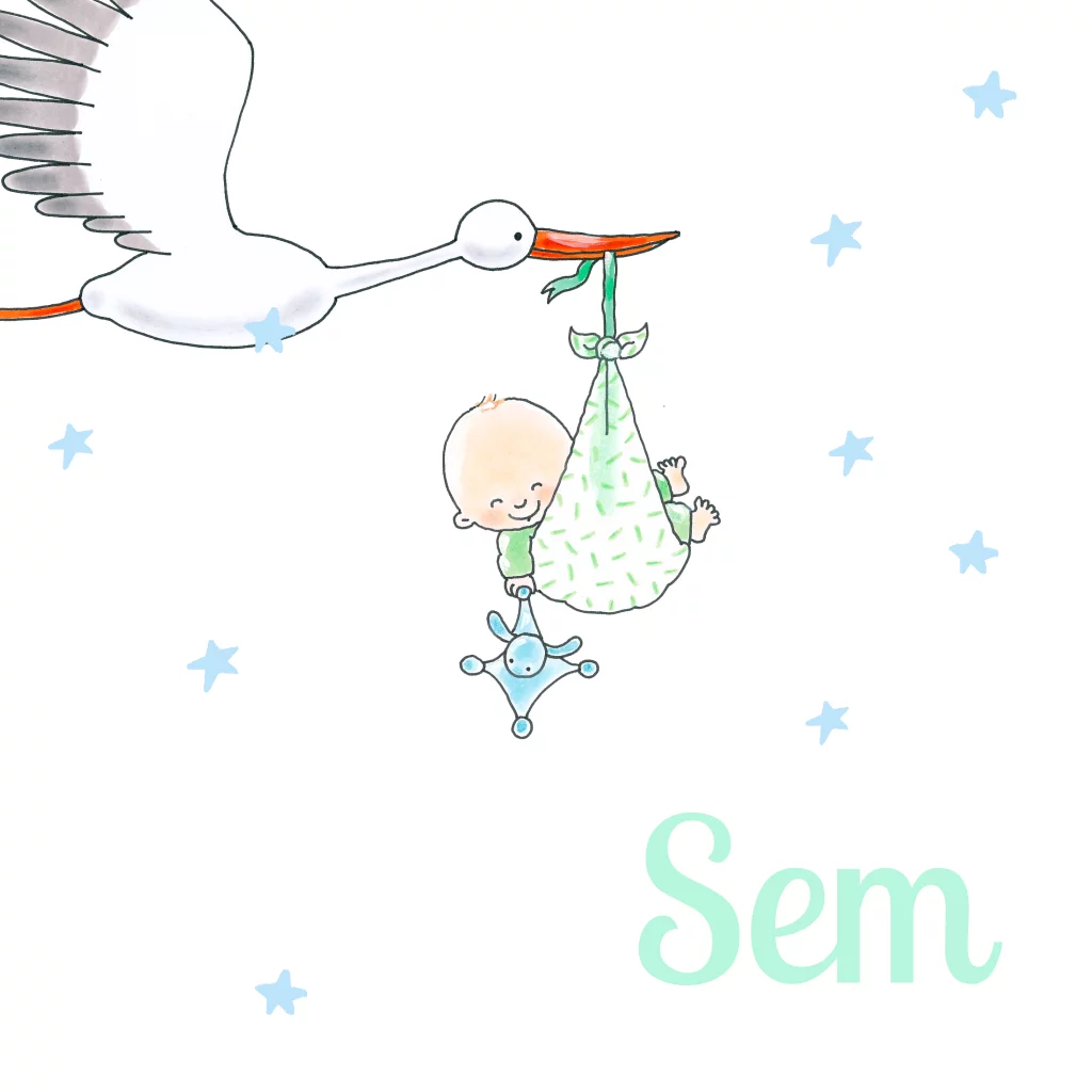 Stoer geboortekaartje voor een zoon met getekend ooievaar, baby en blauwe sterren. Pas kleuren en lettertypen naar wens aan in de editor.