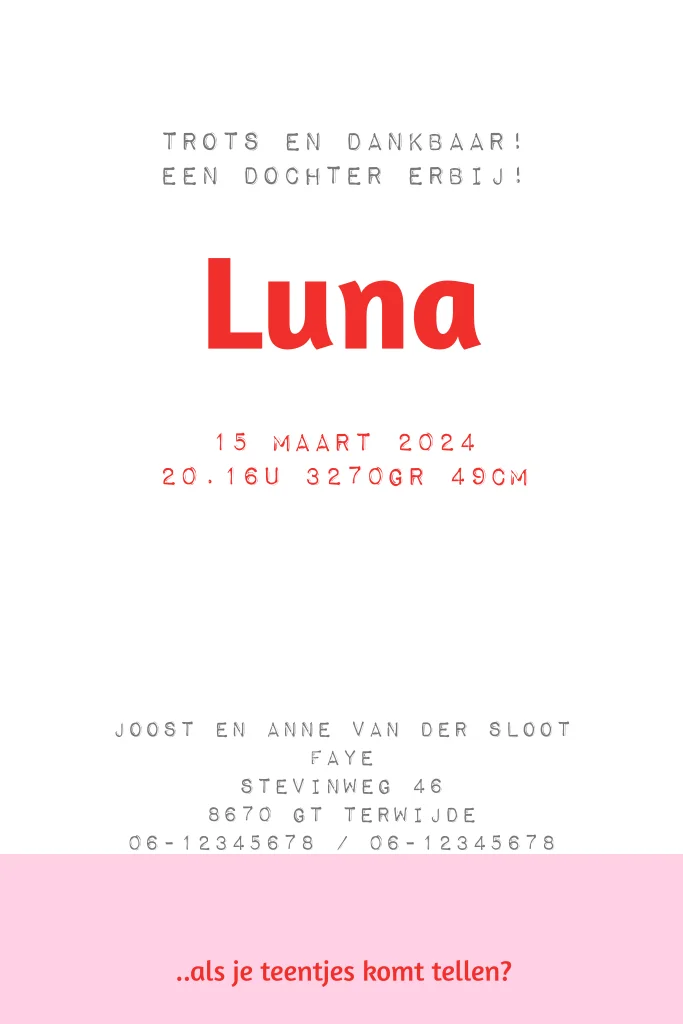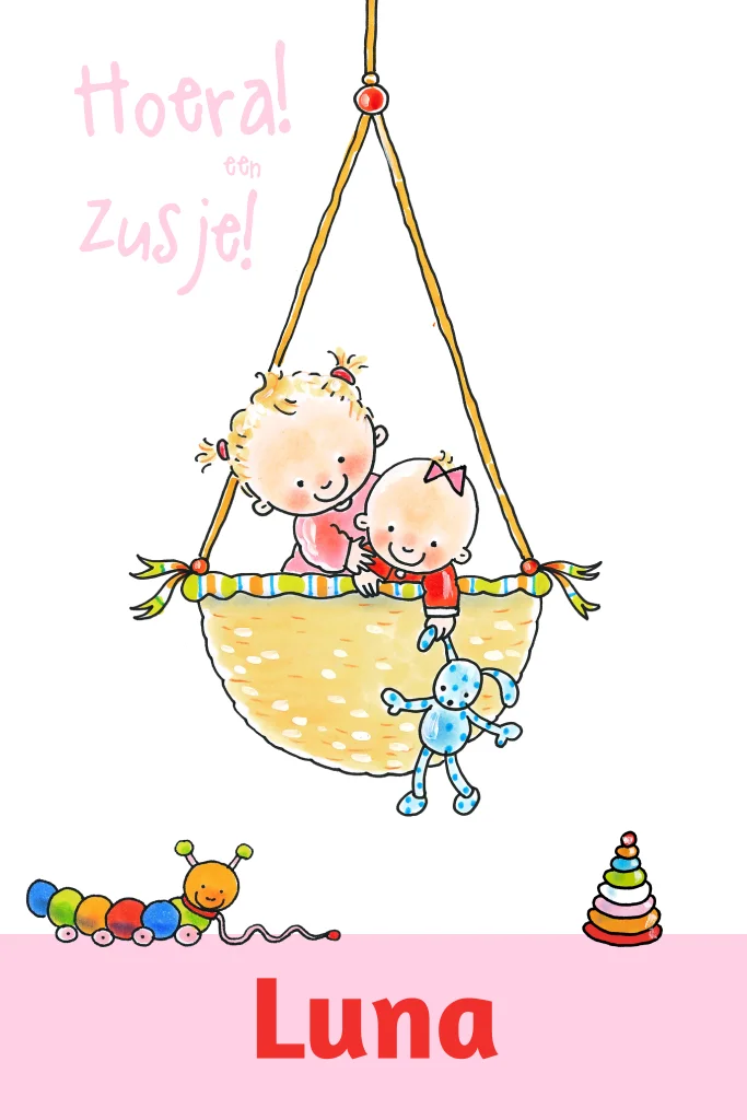 Wat een schattig geboortekaartje! Het zusje houdt de baby vast en het meisje houd de knuffel vast. Samen met het speelgoed en de babykleding, ziet het er verfrissend uit.