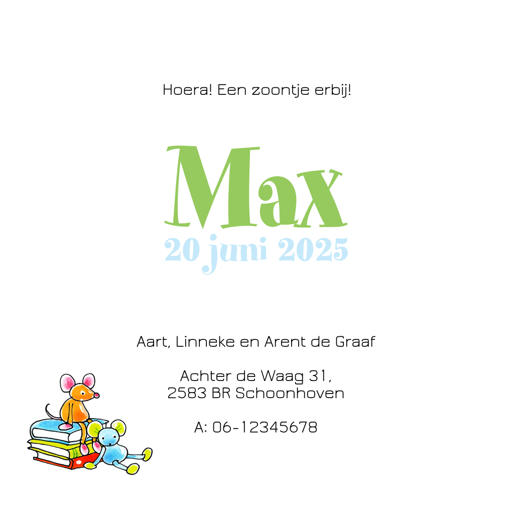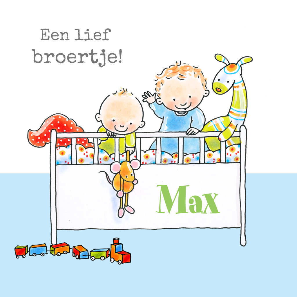 Gefeliciteerd met je tweede kindje! Voor de komst van je baby is het leuk om een geboortekaartje te bestellen waar duidelijk iets op staat over je oudste kind. Dit kan door een gedichtje, maar ook door deze gave illustratie van een grote broer en baby in bed. Je ziet ook knuffels en slingers.
