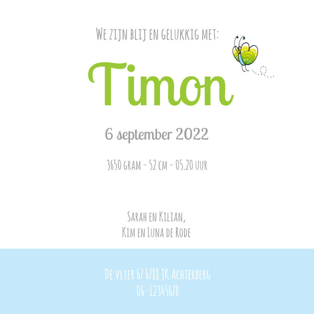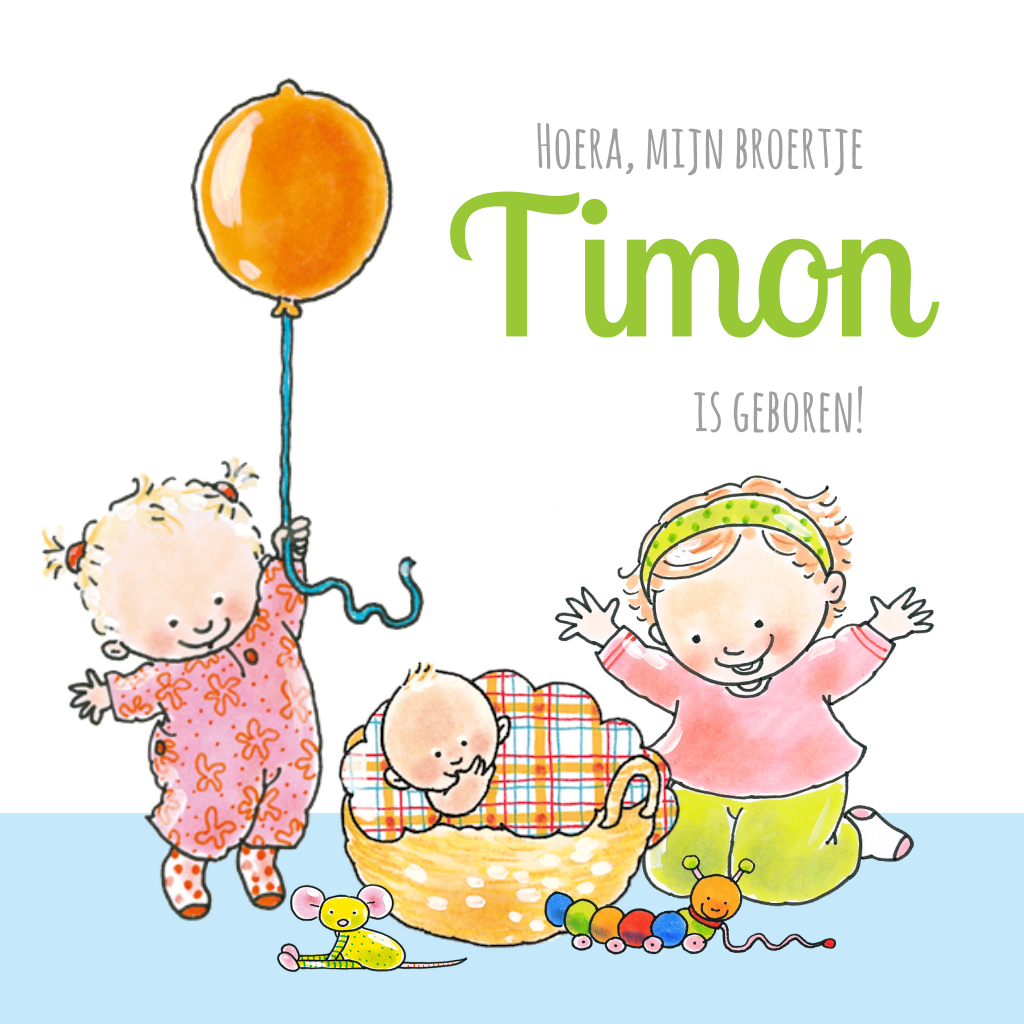 Dit unieke geboortekaartje ontwierp Pauline Oud speciaal voor gezinnen met twee meisjes en een jongen. Zo te zien, zijn de meisjes heel blij met de komst van een jongen in de familie. Zie je ook de leuke details, zoals de ballon, de knuffel en de vlinder?