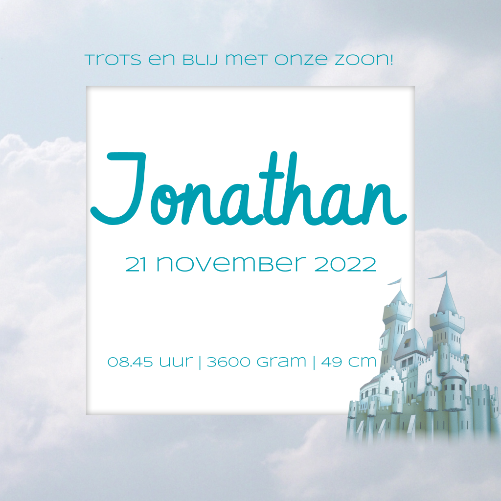 Dit is een echt sprookjes-geboortekaartje in dromerige stijl, met wolken, sterren, maan en natuurlijk een kasteel. Dit maakt het kaartje zowel lief als stoer. Wil je ook de geboortedatum op de voorkant van je kaartje? Dat kan: pas het geboortekaartje zelf aan naar je smaak.