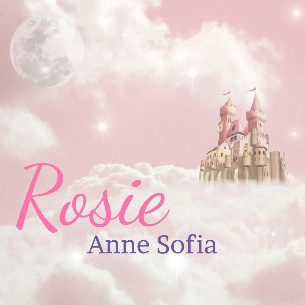 Prachtig roze sprookjes-geboortekaartje met pasteltinten voor een meisje, met wolken en sterren. De naam is geschreven in roze en paars maar de kleur en het lettertype kun je zelf aanpassen. Het kasteel komt weer terug in de binnenkant van de kaart.