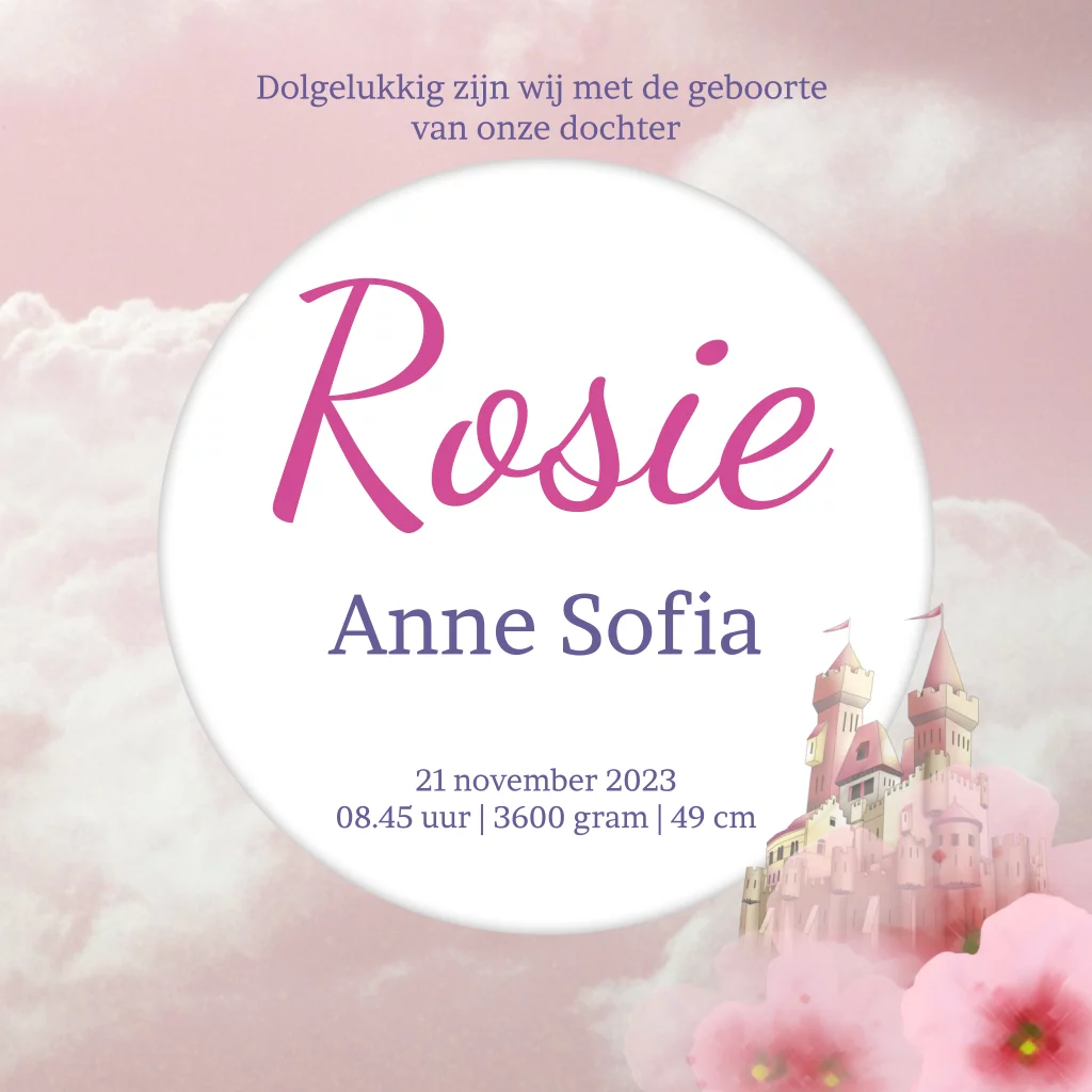 Sprookjes geboortekaartje meisje kasteel in de wolken