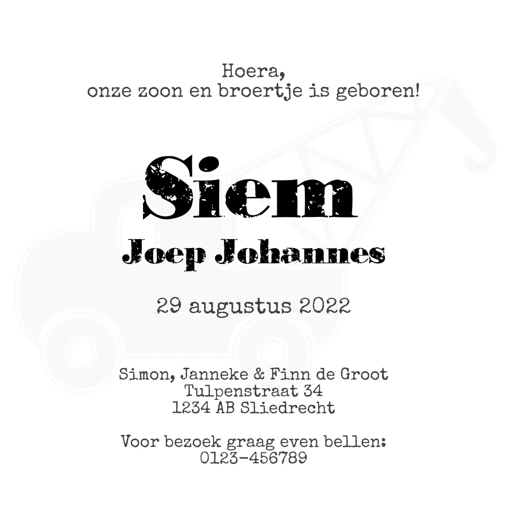 Lief geboortekaartje met een illustratie van een hijskraan. Onderaan zie je een reep met hout, wat voor een leuke afwisseling zorgt. Je kunt in onze kaartenmaker de achtergrond naar wens aanpassen met een kleur of een patroon.