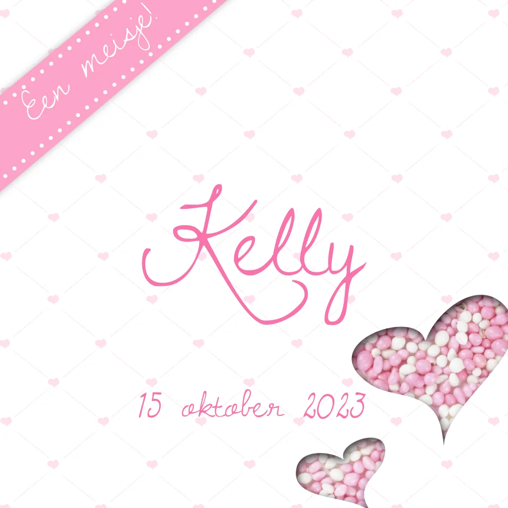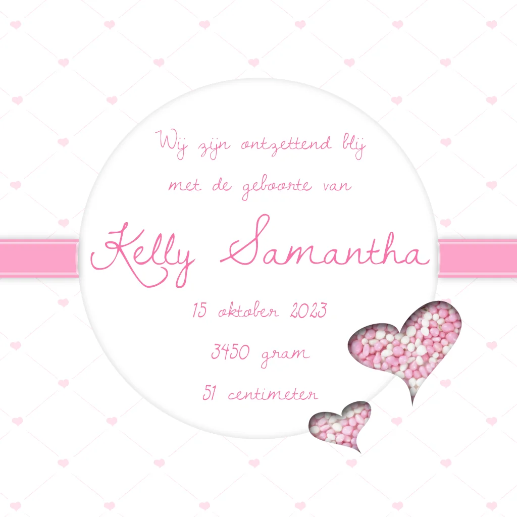 Klassiek geboortekaartje met een witte achtergrond met kleine roze hartjes, om de geboorte van je dochter aan te kondigen. De hartjes met muisjes zorgen voor een origineel detail. Het lettertype kun je zelf aanpassen en ook bijvoorbeeld de plek van de naam.
