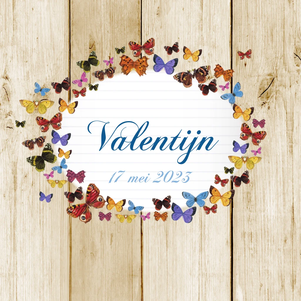 Origineel vintage geboortekaartje met een kader van vlinders: dit zie je nergens anders! De sloophouten achtergrond maakt dit geboortekaartje echt een kadootje op de mat bij je vrienden en familie.