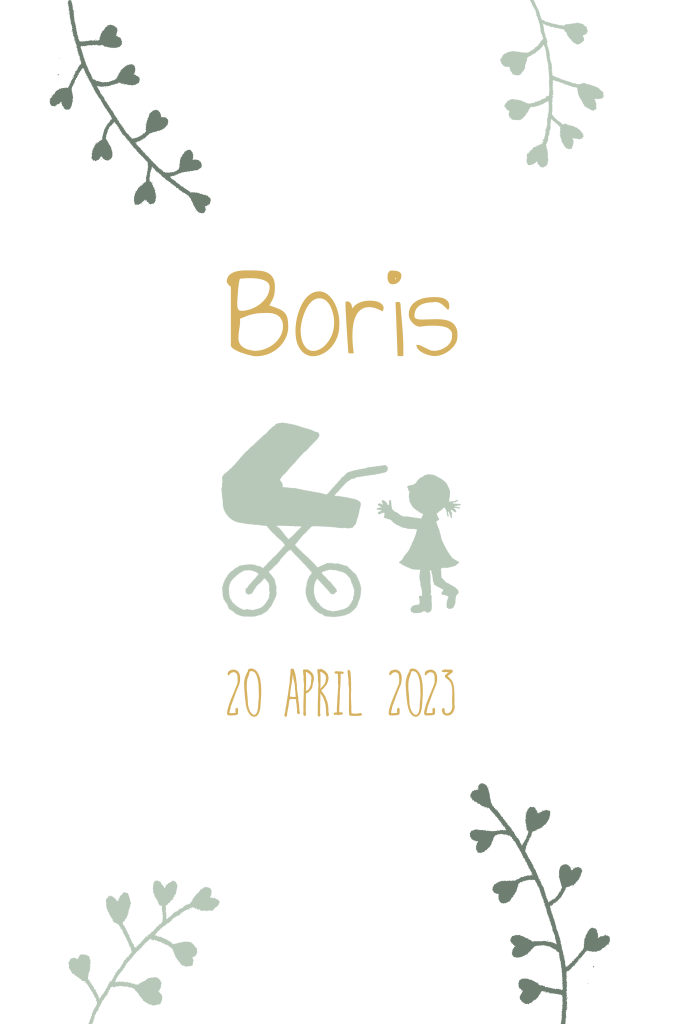 Silhouet geboortekaartje 2e kindje jongen kinderwagen. Voor een andere gezinssamenstelling kun je contact opnemen met de klantenservice. We helpen je graag. (112)