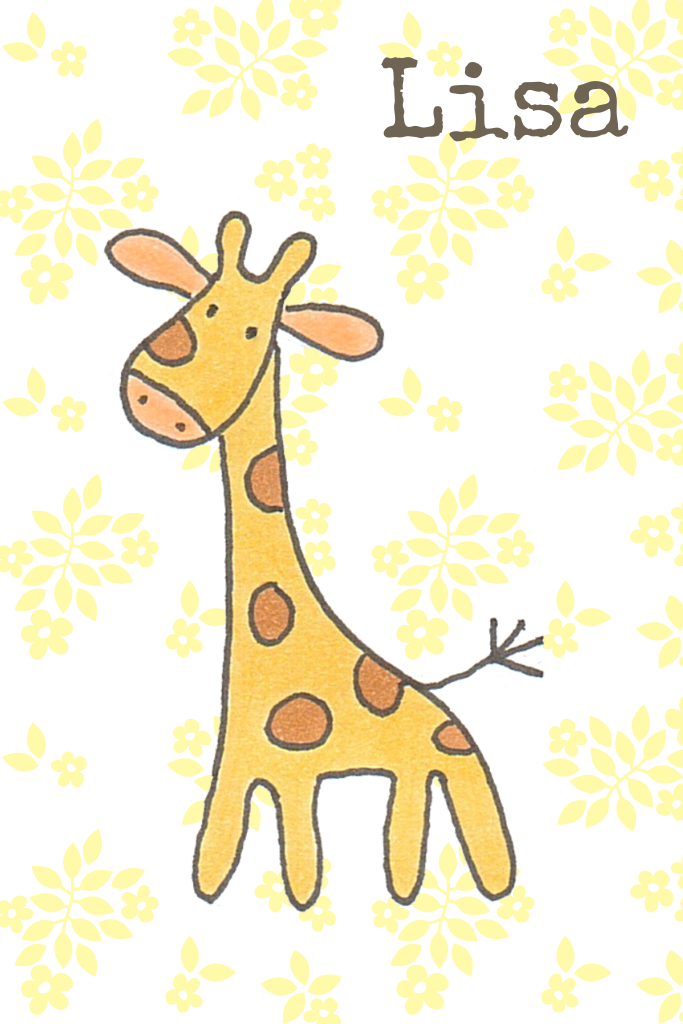 Lief geel kaartje voor de geboorte van een meisje. Met bloemen, giraffe en leuk naamlabel.